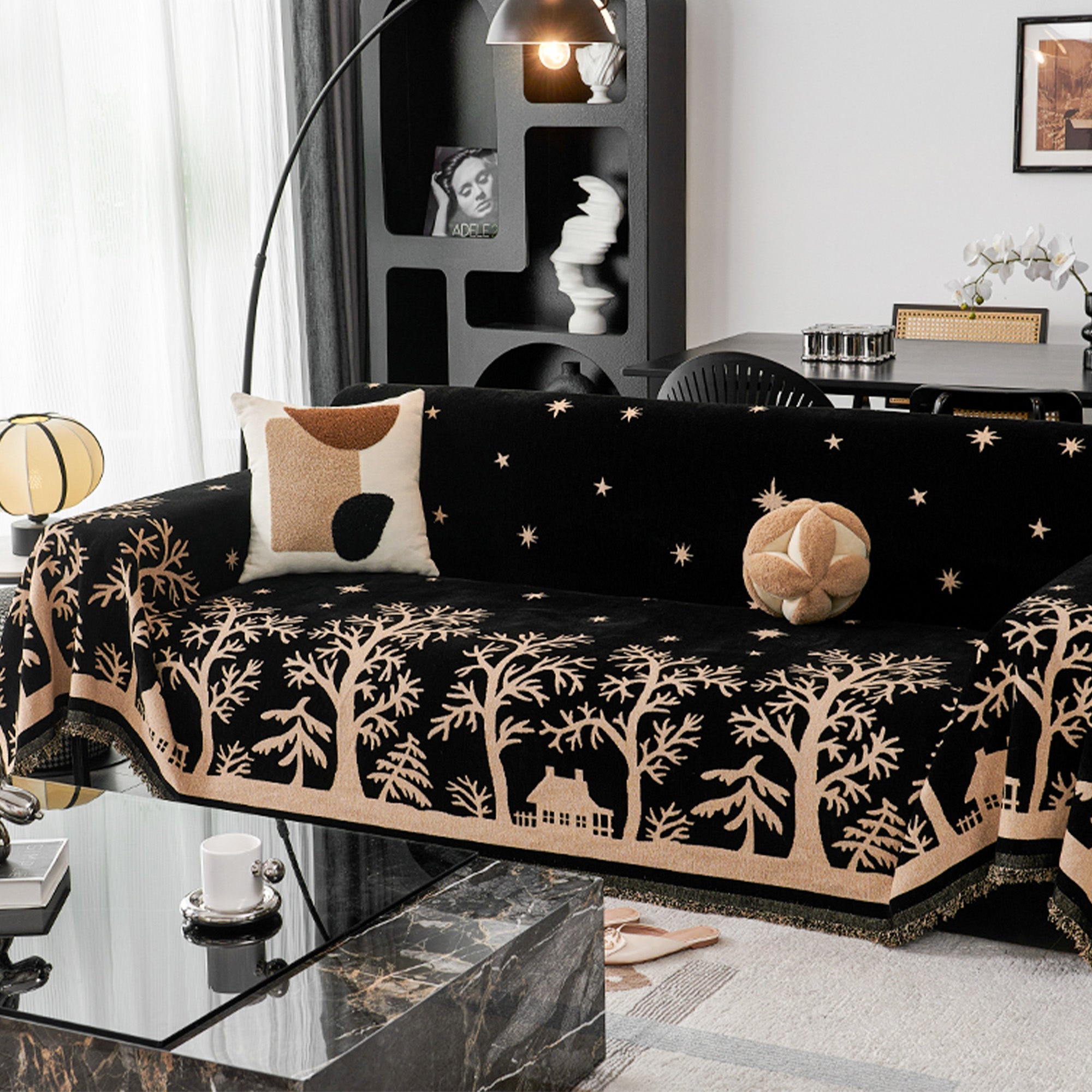 Forvandle sofaen din til et skogsvidunderland med sofatrekket Forest Night Sky. Dette sofatrekket er designet for å blande kunst og praktisk bruk, og er den ultimate løsningen for å beskytte møblene dine samtidig som det gir et snev av eleganse. Med en rolig skogsilhuett under en stjernehimmel skaper dette trekket en beroligende atmosfære i ethvert oppholdsrom.
