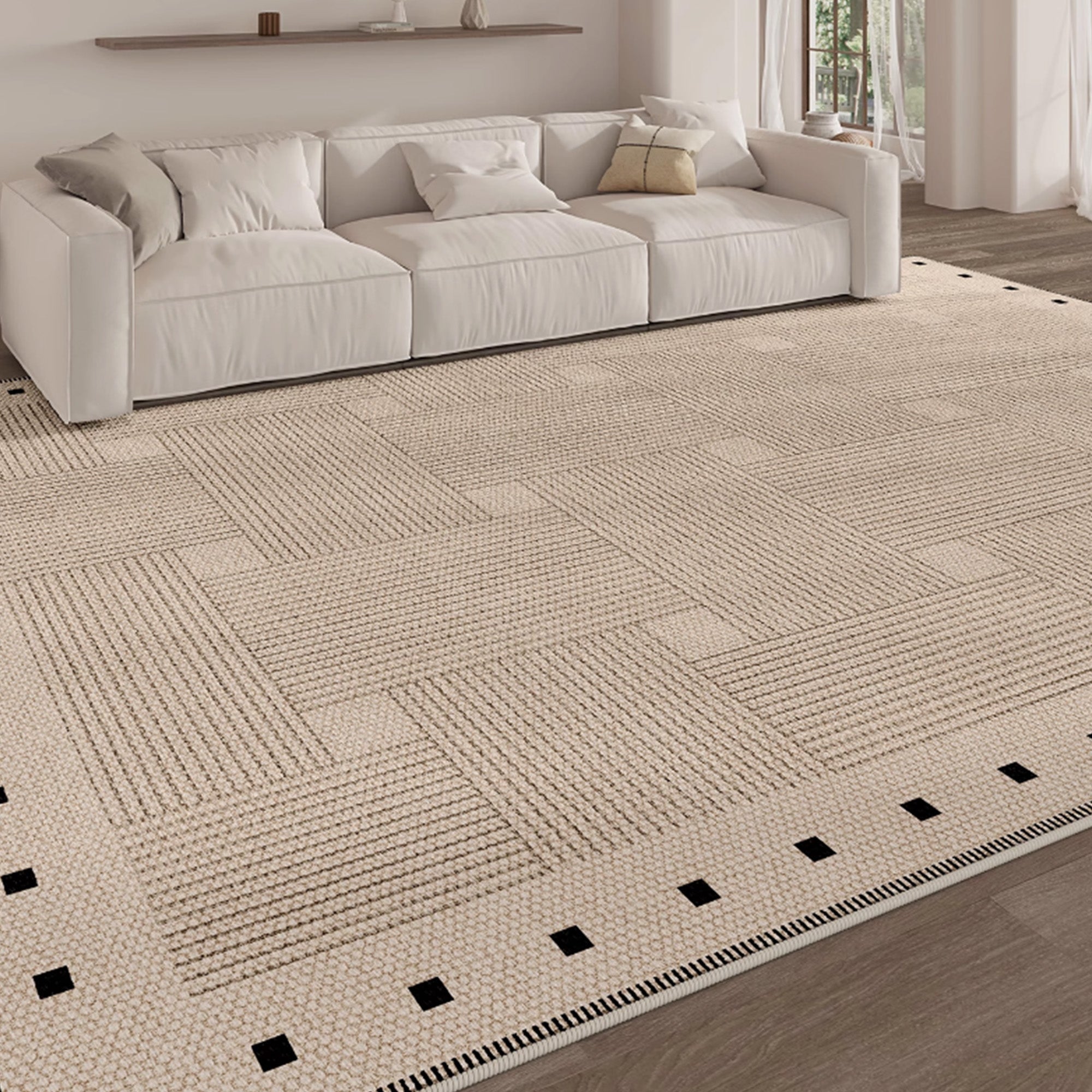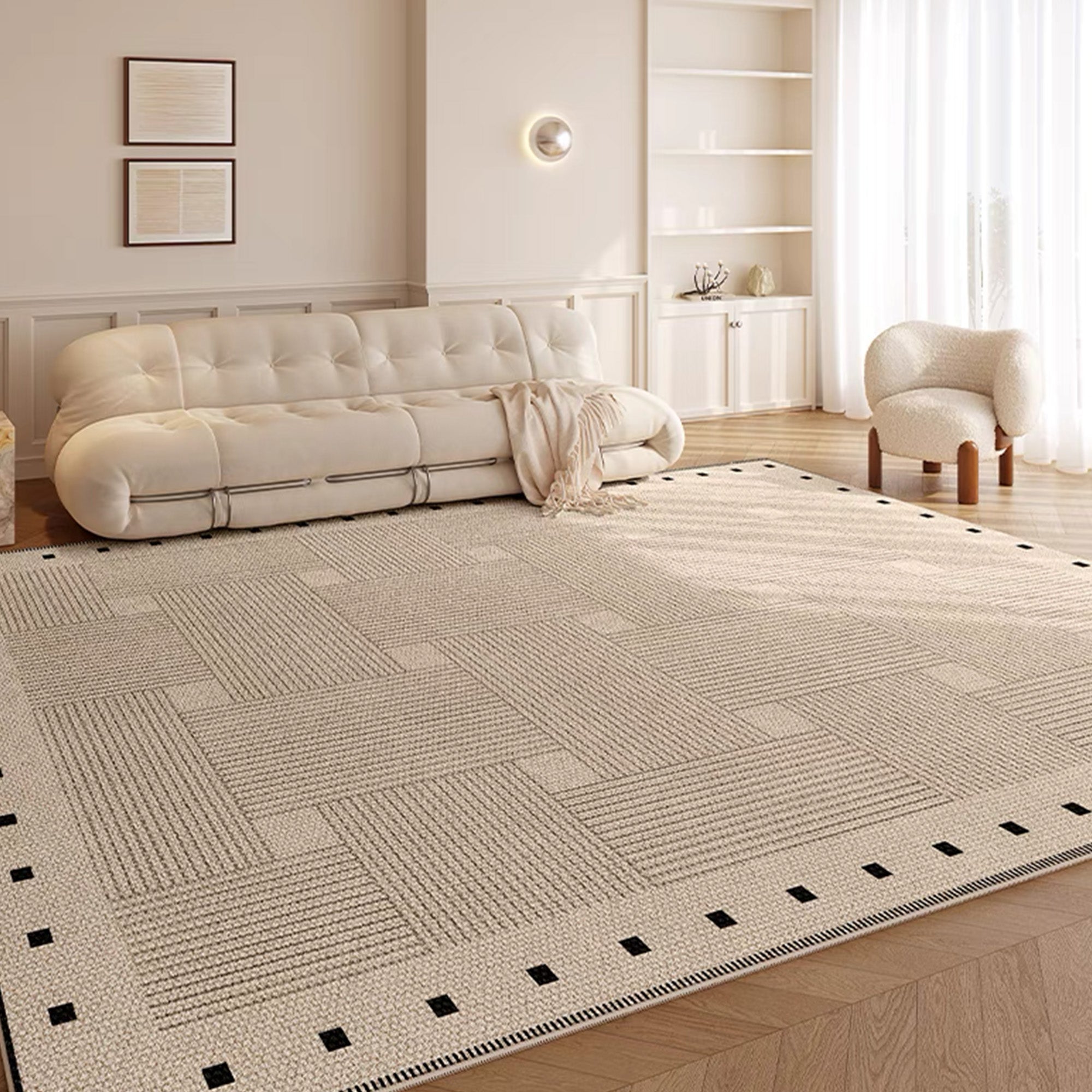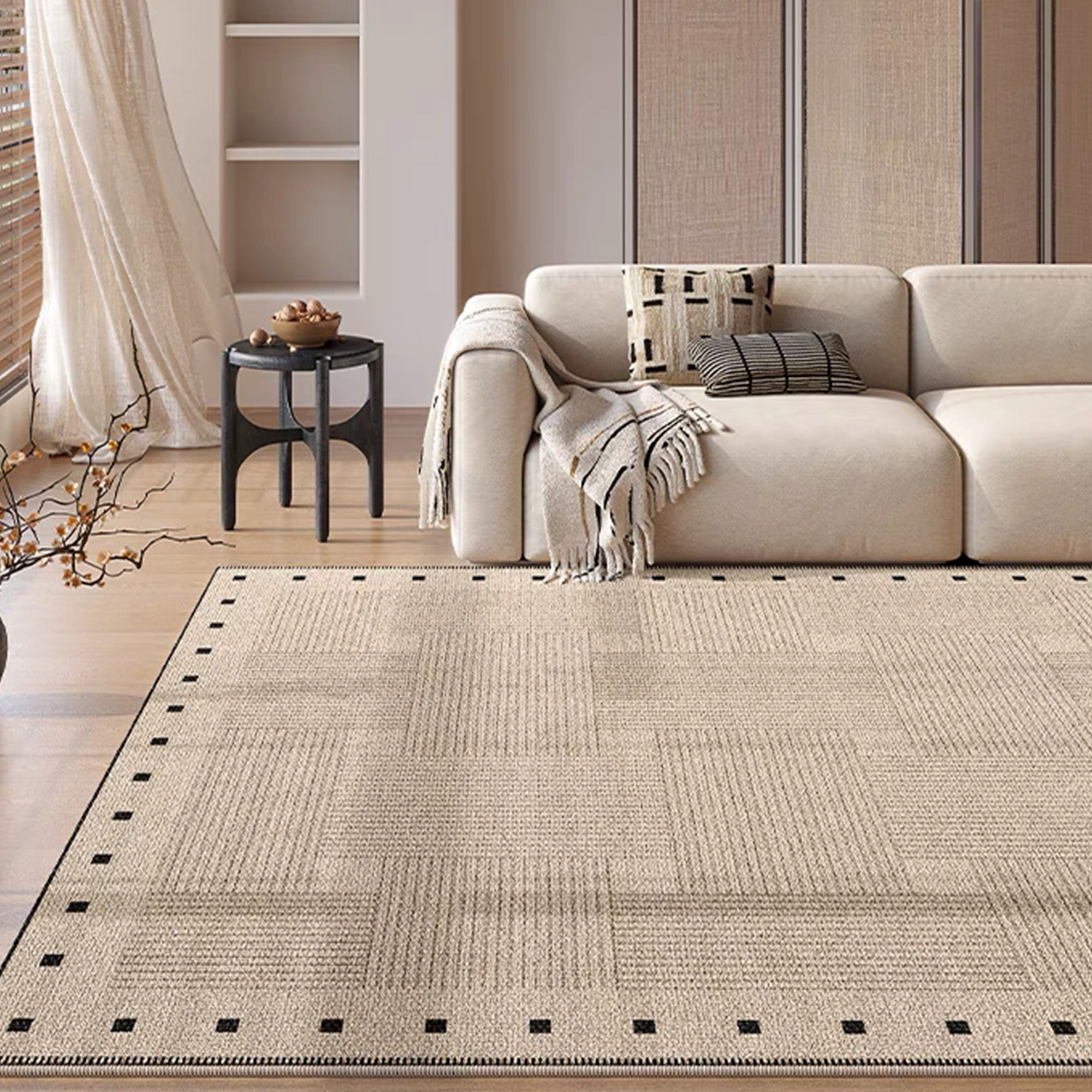 Tilfør tidløs eleganse til stuen din med vårt klassiske sjakkbrettteppe. Dette teppet har en sofistikert beige tone med et teksturert sjakkbrettmønster, og er fremhevet av en raffinert kant med svarte firkantede detaljer for ekstra visuell interesse. Laget av slitesterke fibre av høy kvalitet, er dette teppet designet for å tåle daglig bruk, og tilbyr både stil og praktisk innredning til hjemmet ditt.