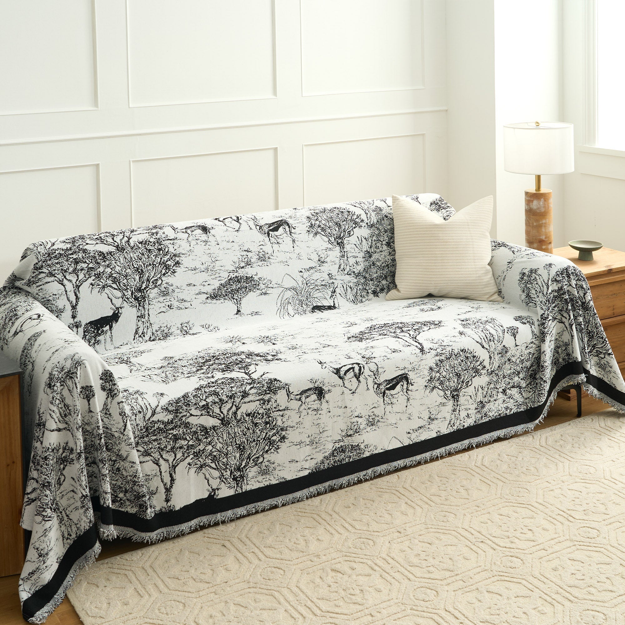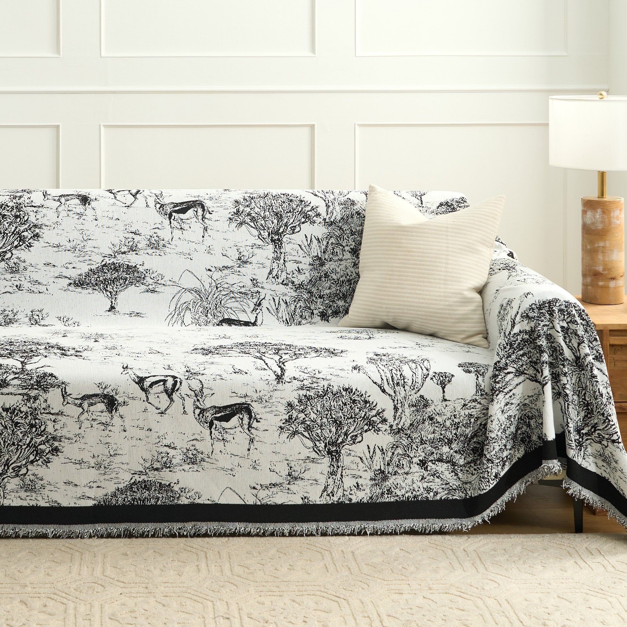 Få et snev av villmark inn i hjemmet ditt med vårt sofatrekk til Safari Scene. Dette fantastiske trekket, med detaljerte skildringer av grasiøse antiloper og frodige savannelandskap, gir en sofistikert, men likevel eventyrlig aksent til boarealet ditt. Den monokrome paletten blander seg uanstrengt med både moderne og klassisk interiør, og gir både karakter og eleganse til innredningen din. Perfekt for naturelskere og de som søker unike designelementer, beskytter dette trekket møblene dine samtidig som det skaper en visuell reise til de afrikanske slettene.