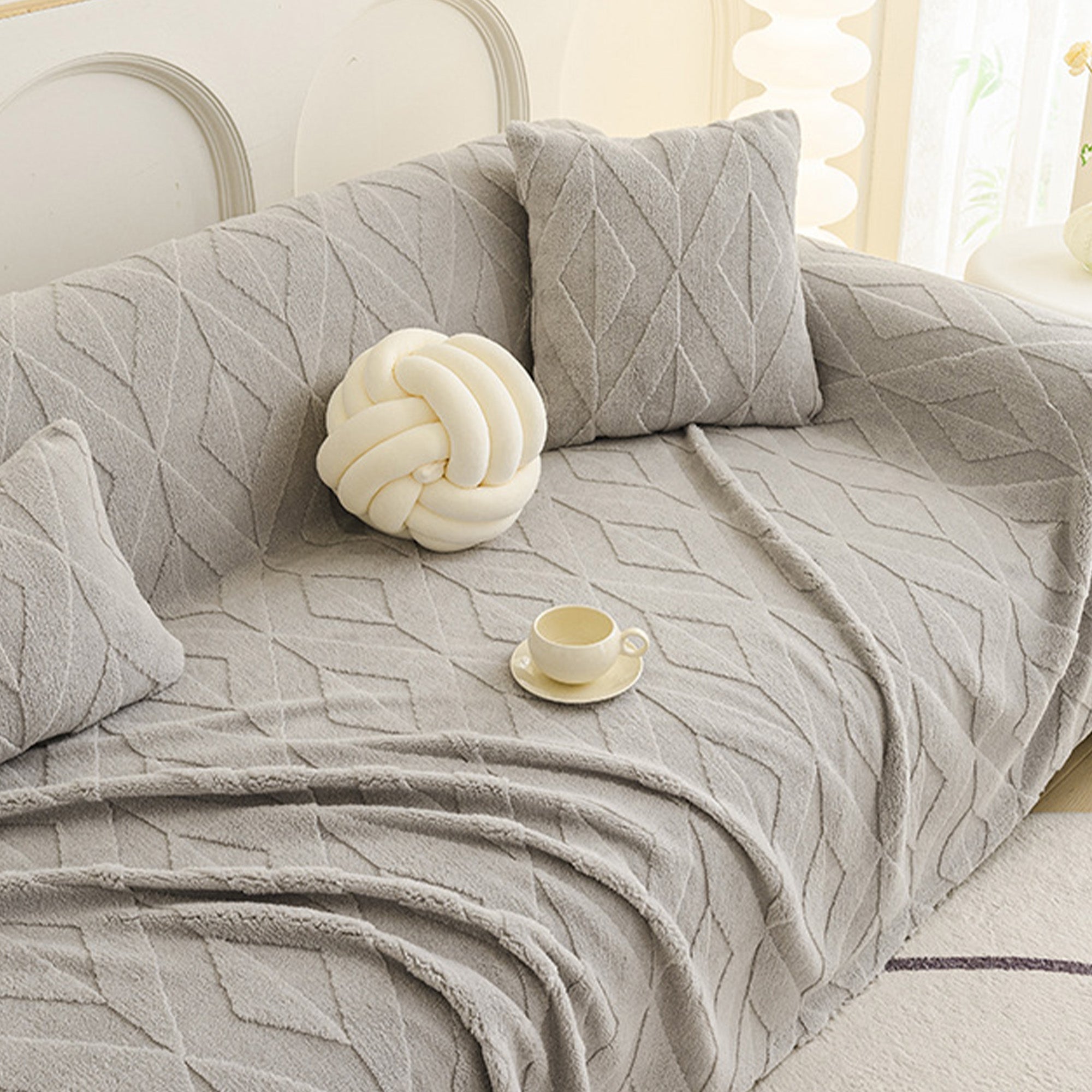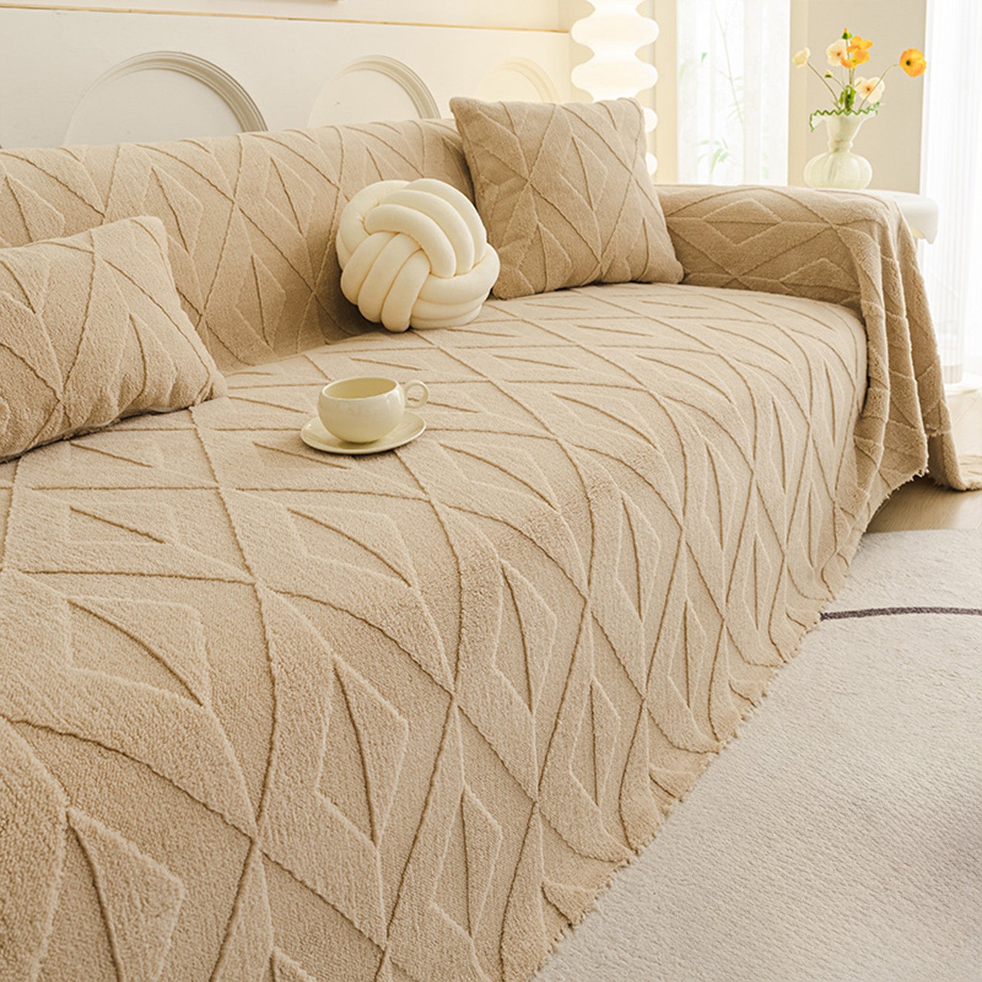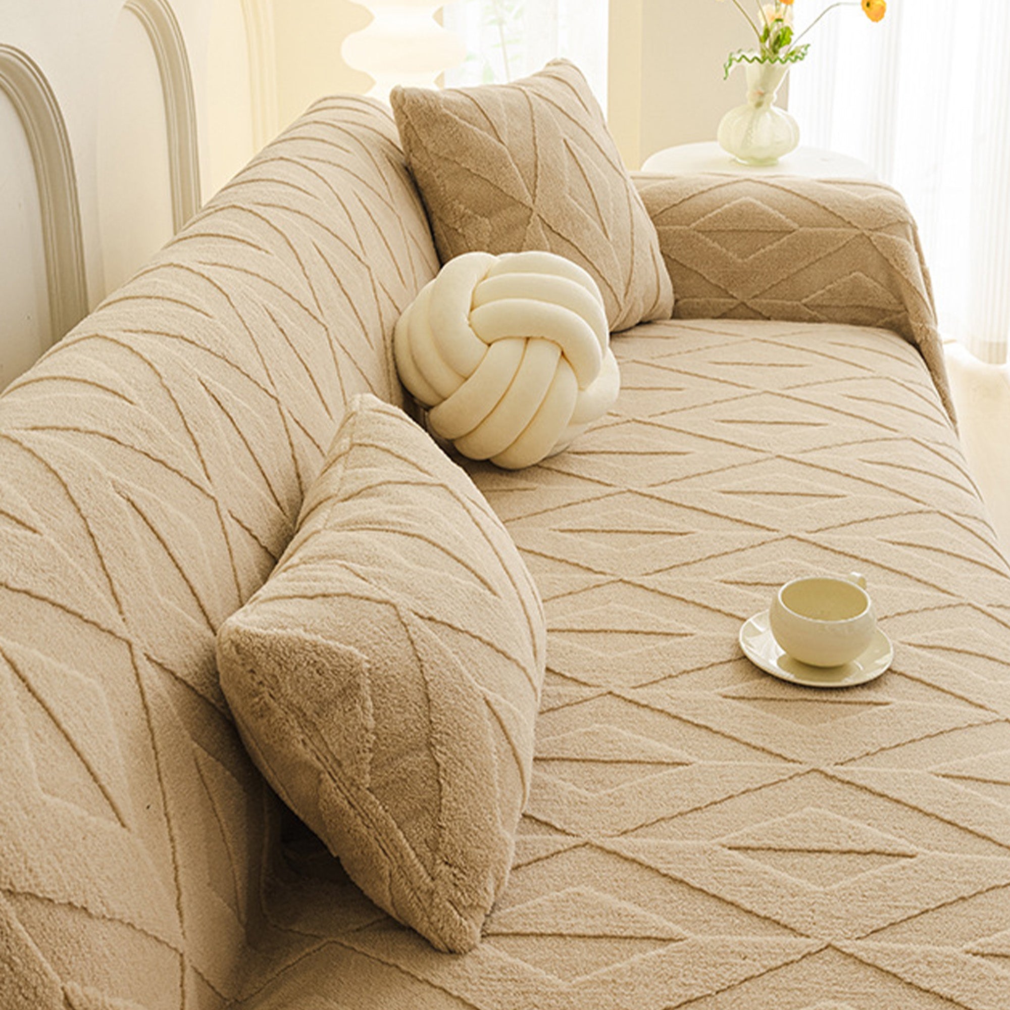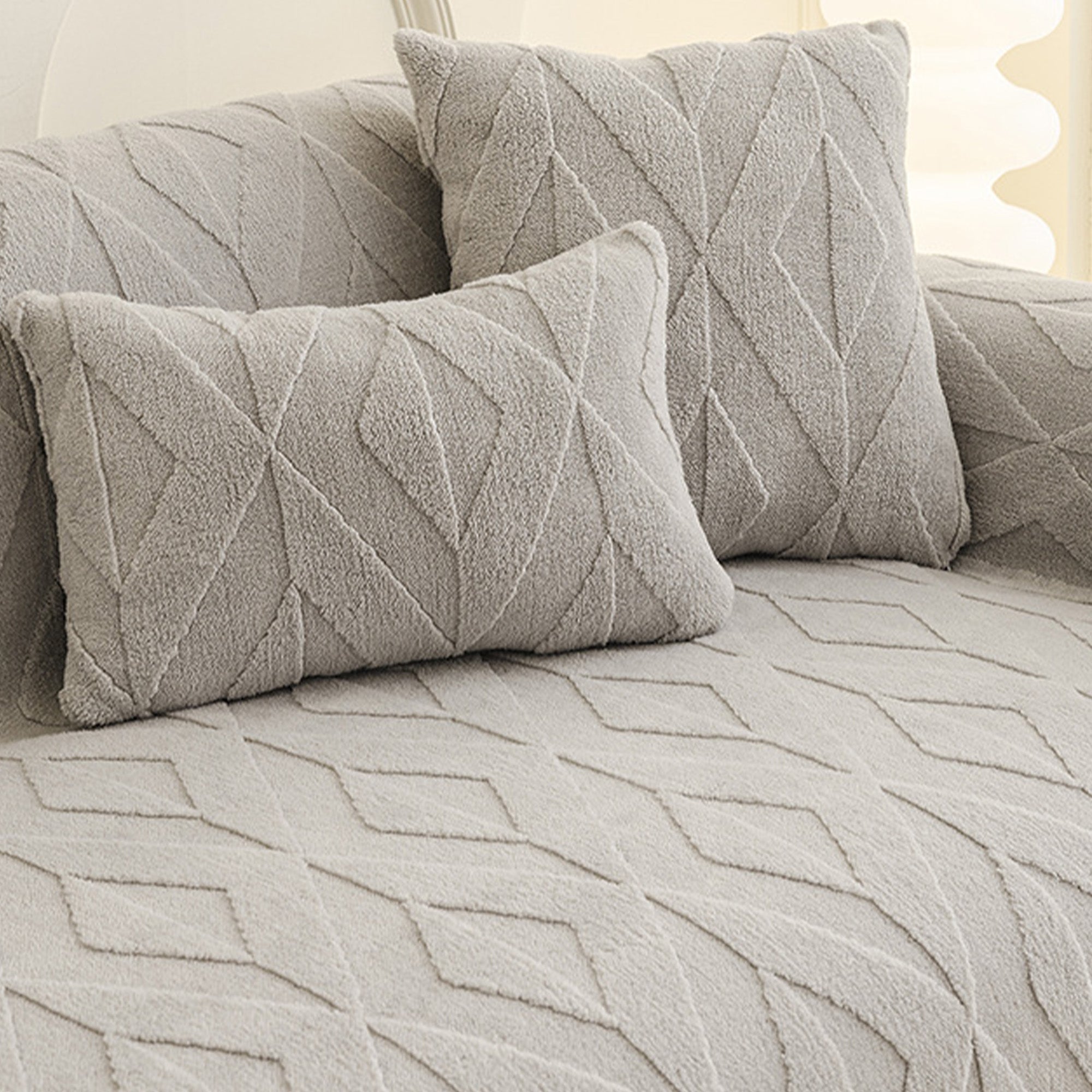 Inspirert av elegante diamantmønstre, gir dette plysjtrekket til sofaen raffinert komfort og eleganse til ethvert oppholdsrom. Laget av førsteklasses plysjstoff, gir det en myk, men slitesterk følelse samtidig som det gir pålitelig beskyttelse mot daglig slitasje, dyrehår og riper. Designet med både skjønnhet og praktisk funksjonalitet i tankene, forbedrer det uanstrengt innredningen din samtidig som det holder sofaen frisk og ren.