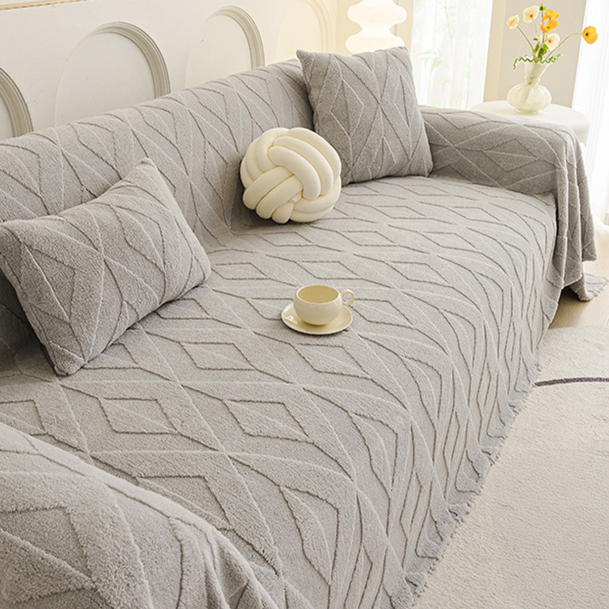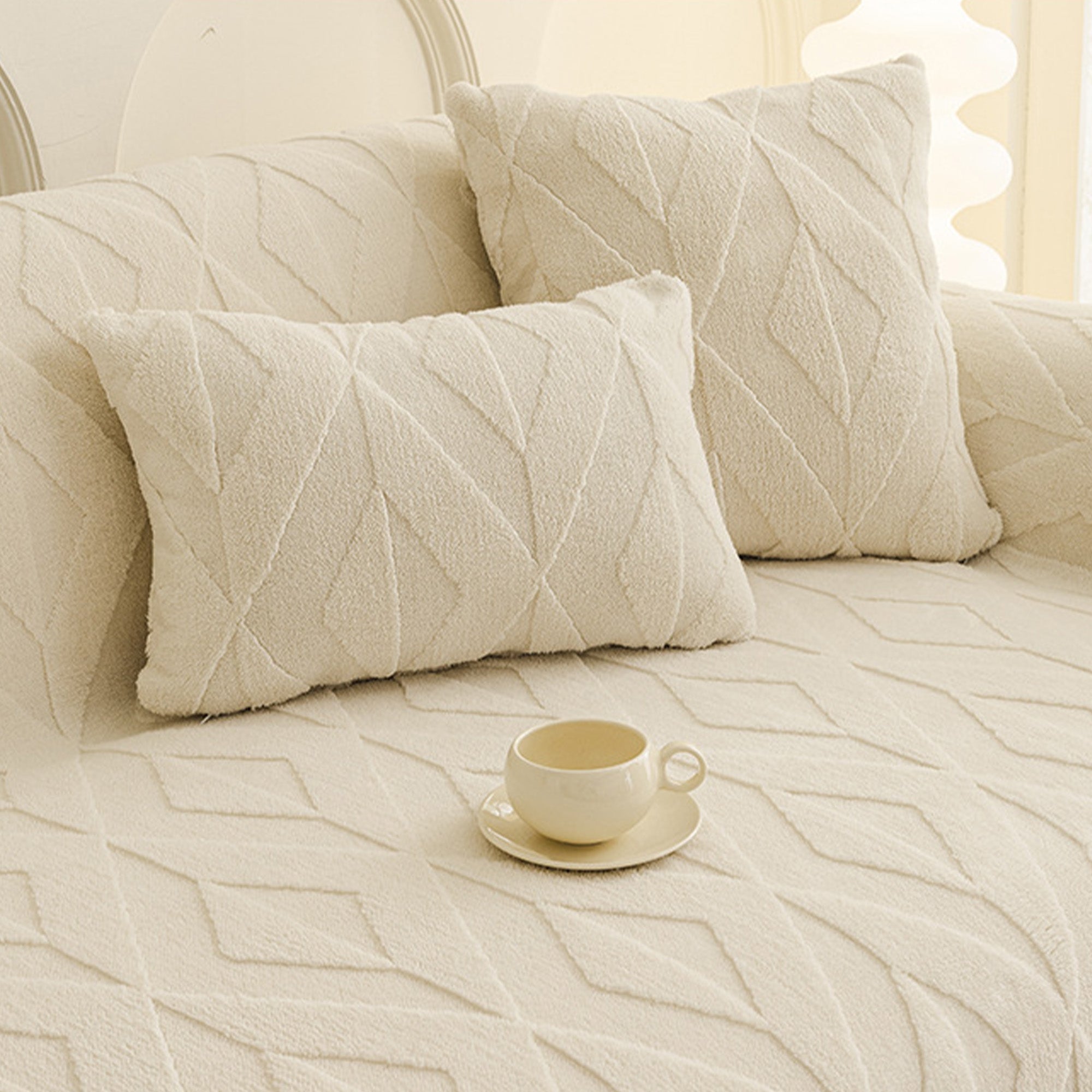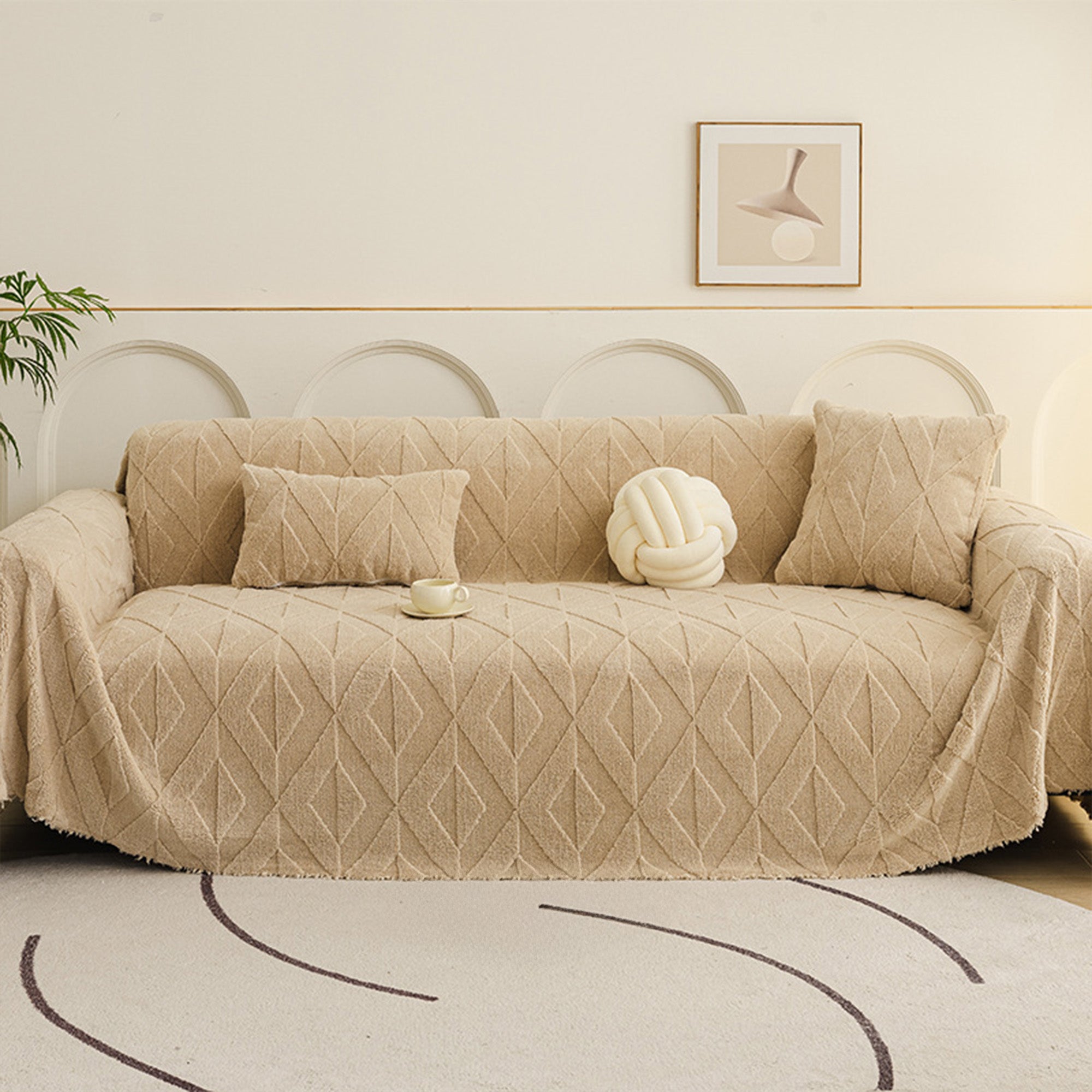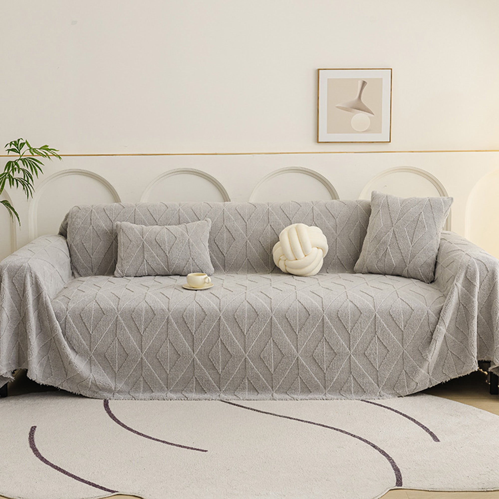 Inspirert av elegante diamantmønstre, gir dette plysjtrekket til sofaen raffinert komfort og eleganse til ethvert oppholdsrom. Laget av førsteklasses plysjstoff, gir det en myk, men slitesterk følelse samtidig som det gir pålitelig beskyttelse mot daglig slitasje, dyrehår og riper. Designet med både skjønnhet og praktisk funksjonalitet i tankene, forbedrer det uanstrengt innredningen din samtidig som det holder sofaen frisk og ren.