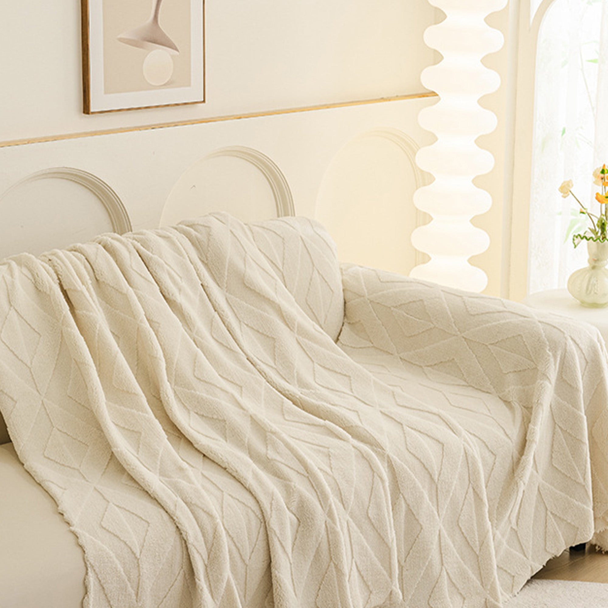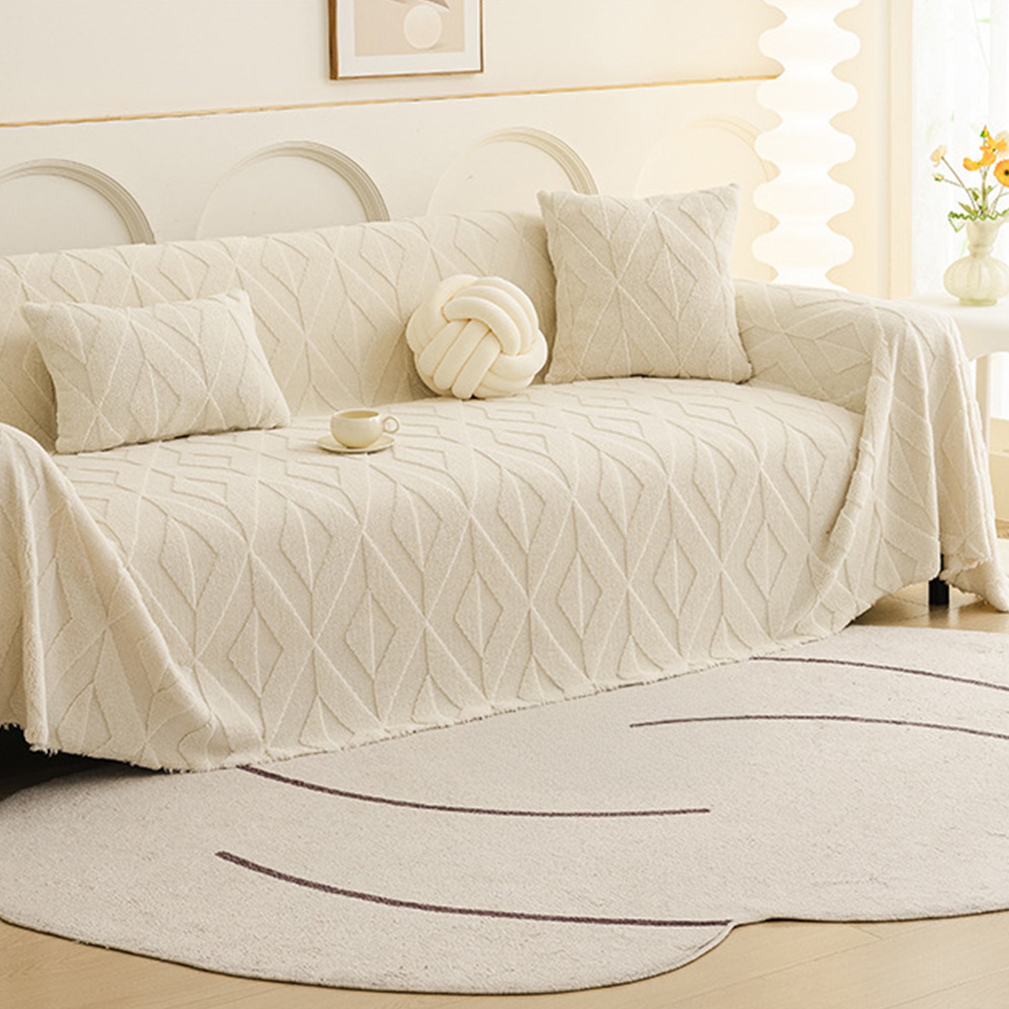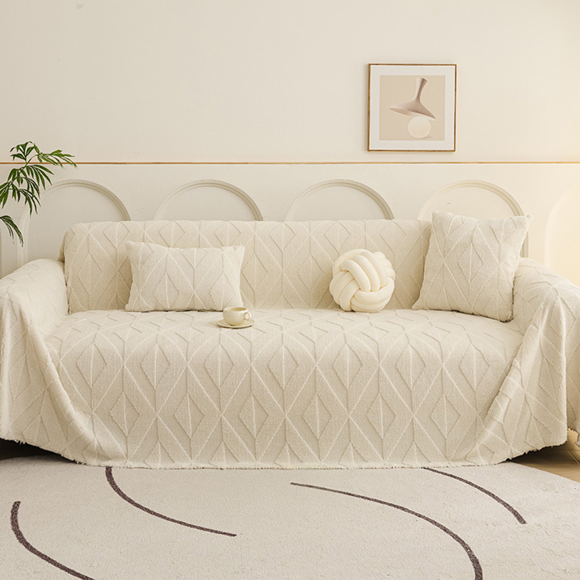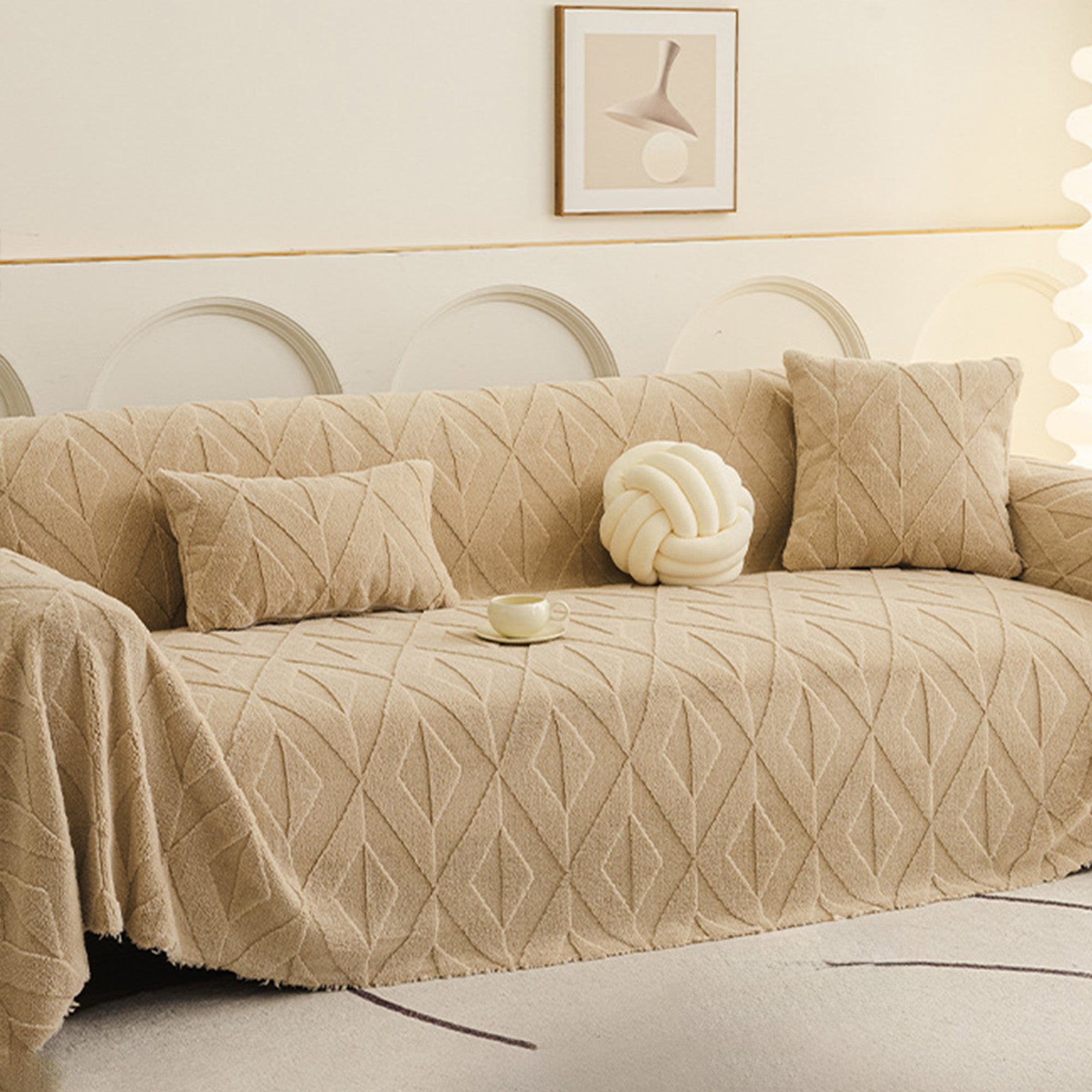 Inspirert av elegante diamantmønstre, gir dette plysjtrekket til sofaen raffinert komfort og eleganse til ethvert oppholdsrom. Laget av førsteklasses plysjstoff, gir det en myk, men slitesterk følelse samtidig som det gir pålitelig beskyttelse mot daglig slitasje, dyrehår og riper. Designet med både skjønnhet og praktisk funksjonalitet i tankene, forbedrer det uanstrengt innredningen din samtidig som det holder sofaen frisk og ren.