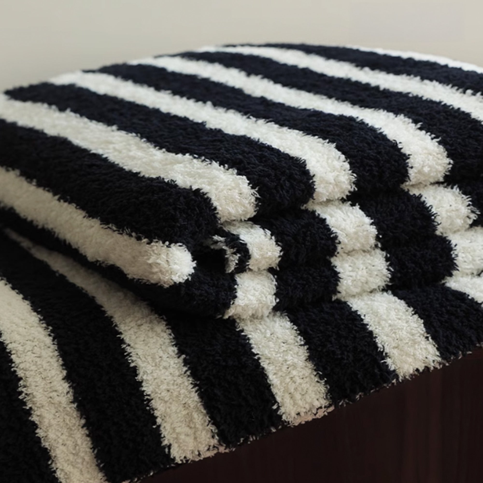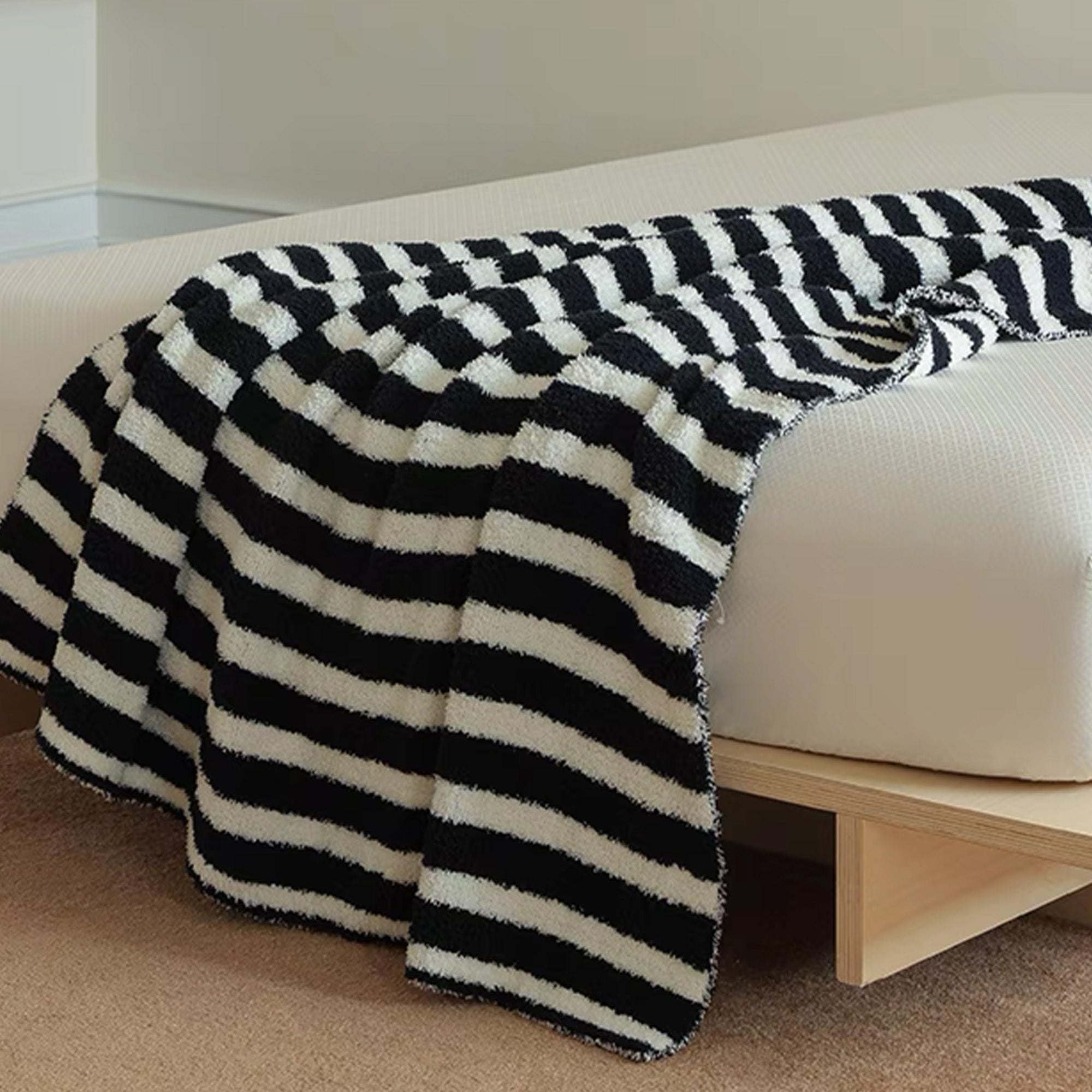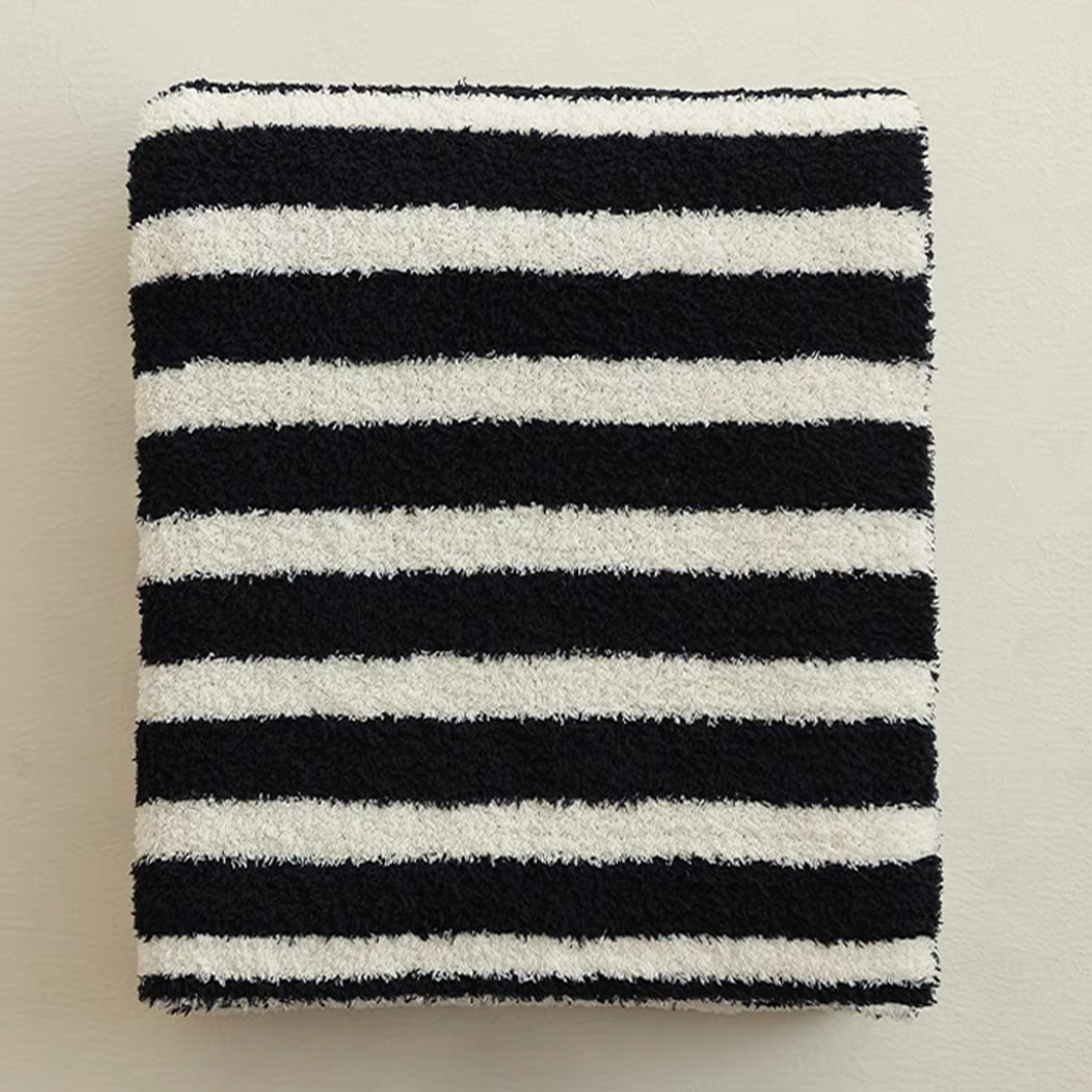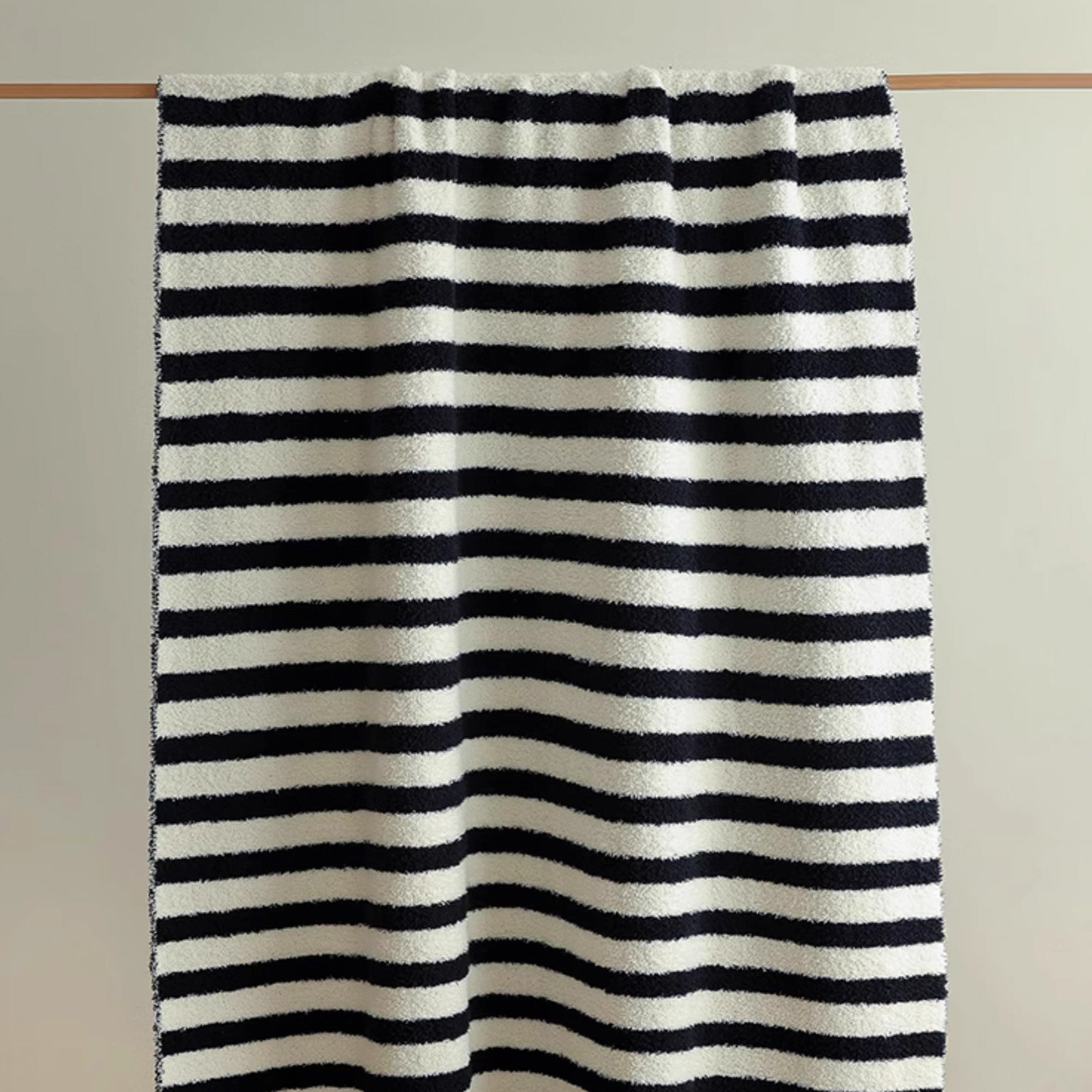 For de som elsker dristig stil uten å gå på kompromiss med komfort, er dette svart-hvite stripete plysjteppet akkurat det rette. Det er mykt, slående og perfekt for å gi et personlig preg til ethvert rom. Enten det henger over sofaen, stolen eller sengen, er dette teppet klart for alle dine koselige øyeblikk.