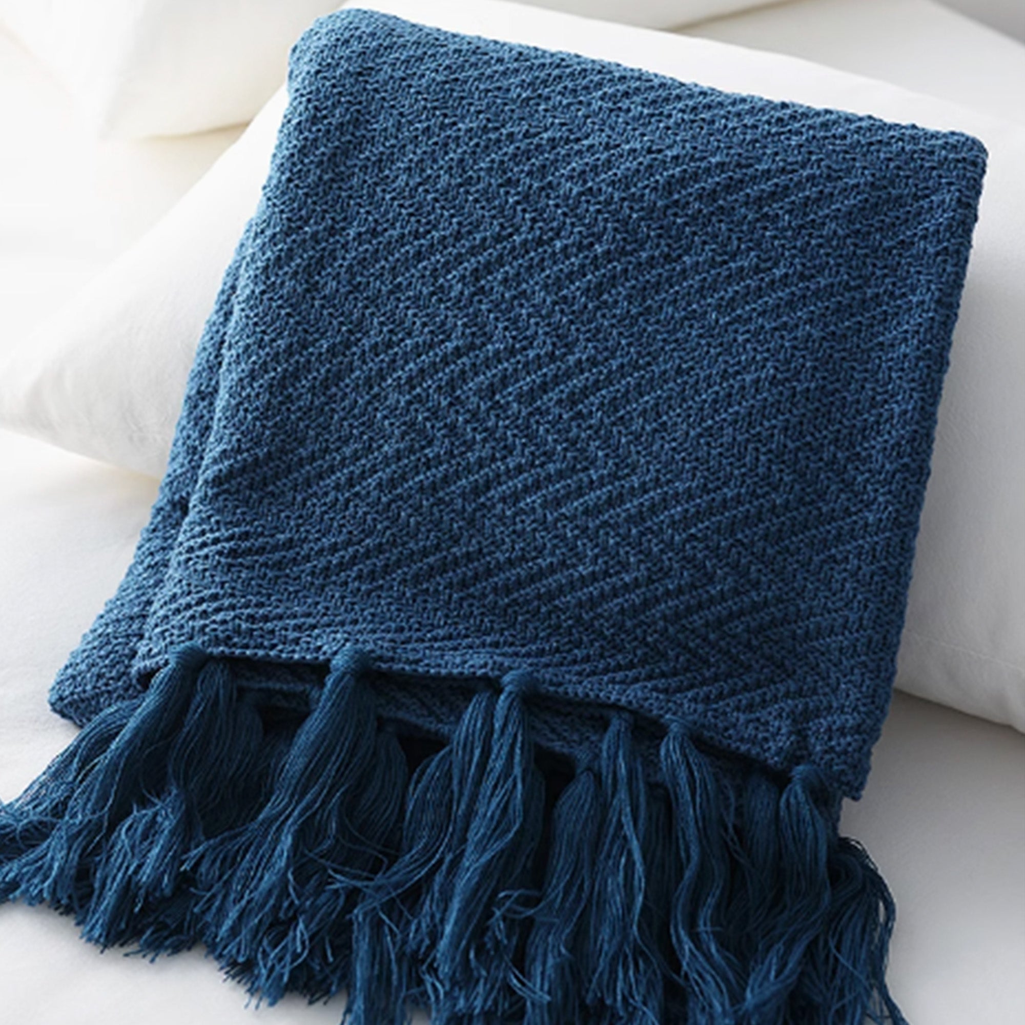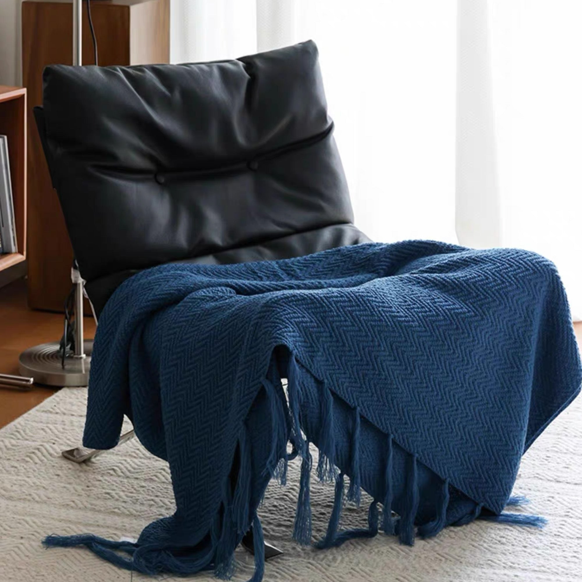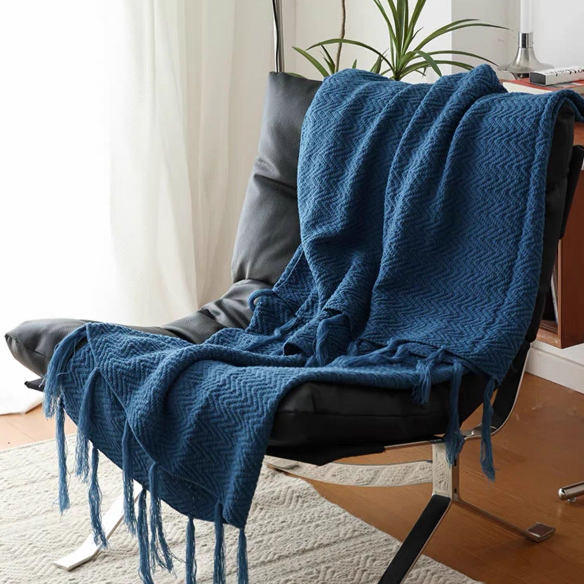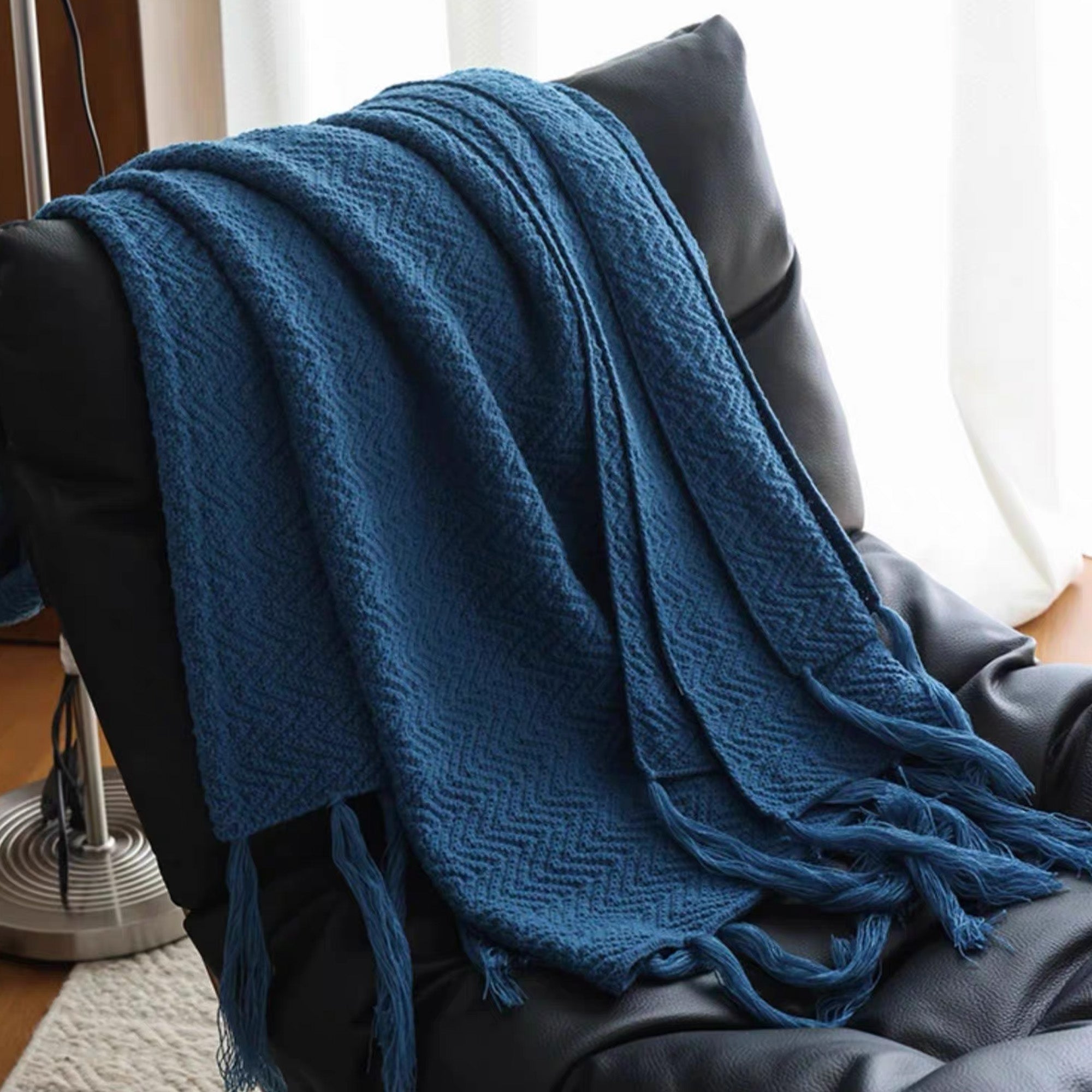 Omfavn varmen og elegansen i skandinavisk design med vårt nordiske strikkede kasteteppe. Dette rikt teksturerte, dypblå teppet har et klassisk fiskebensmønster og er utsmykket med lange, flagrende dusker, noe som gir et koselig og stilig lag til ethvert rom. Perfekt for å pakke seg inn i på kjølige kvelder eller som et vakkert dekorativt element for sofaer, senger eller lesekroker.