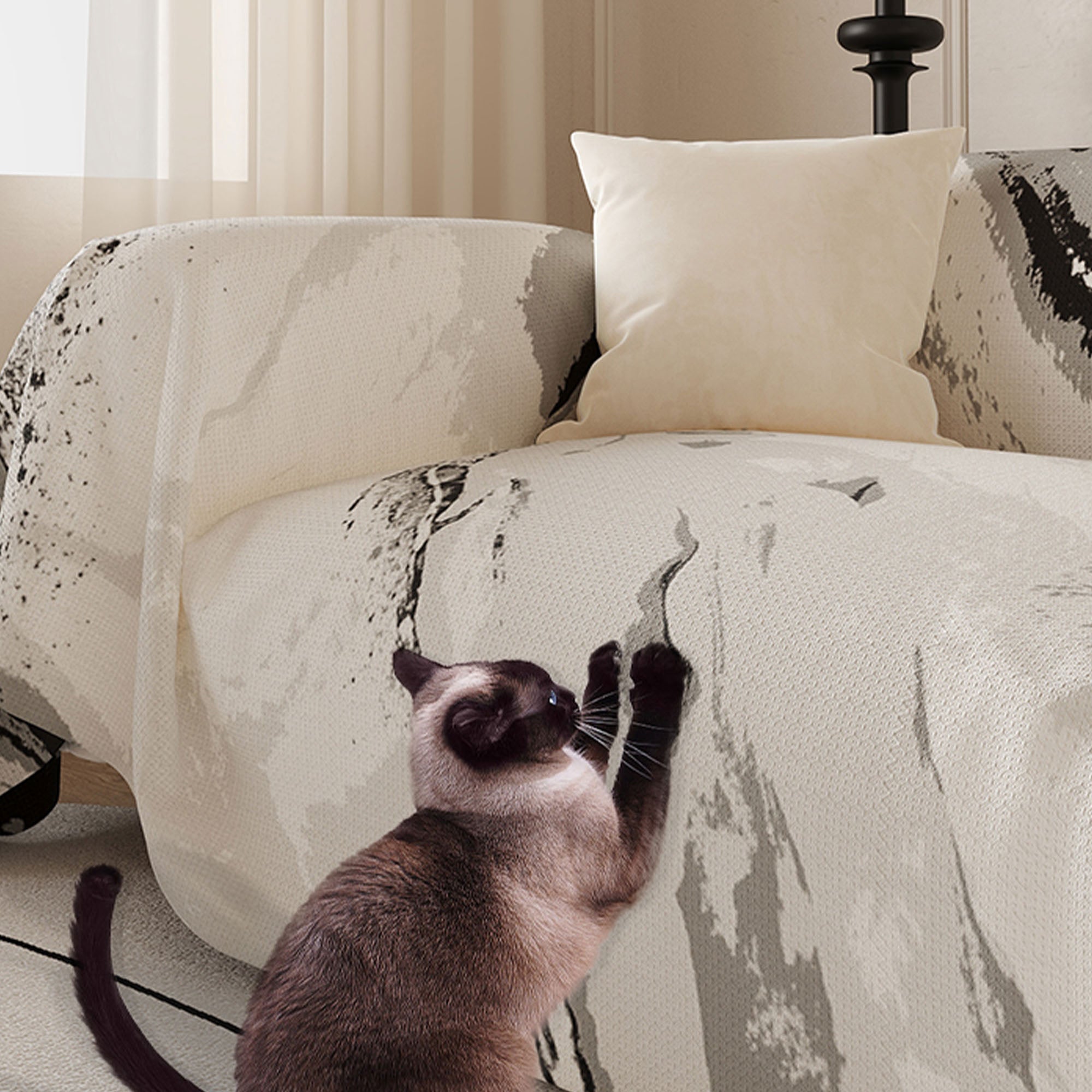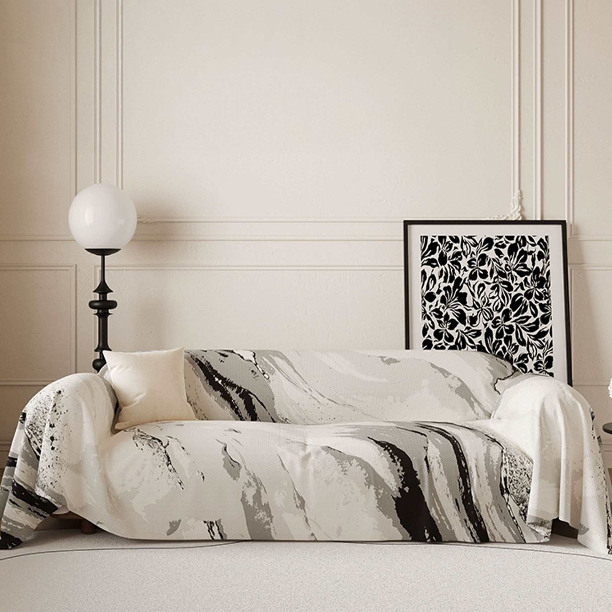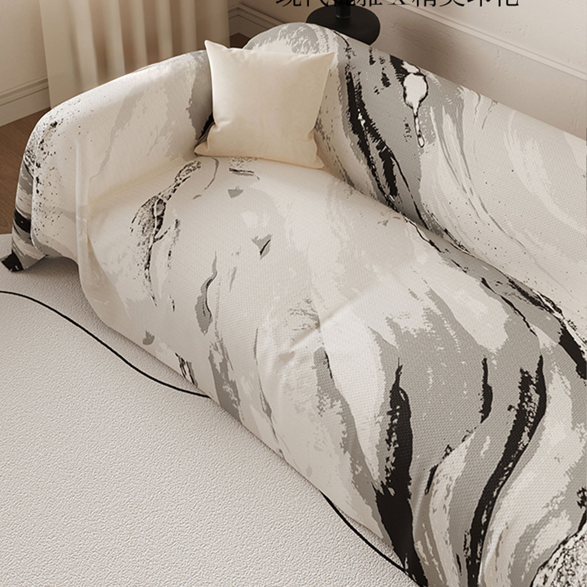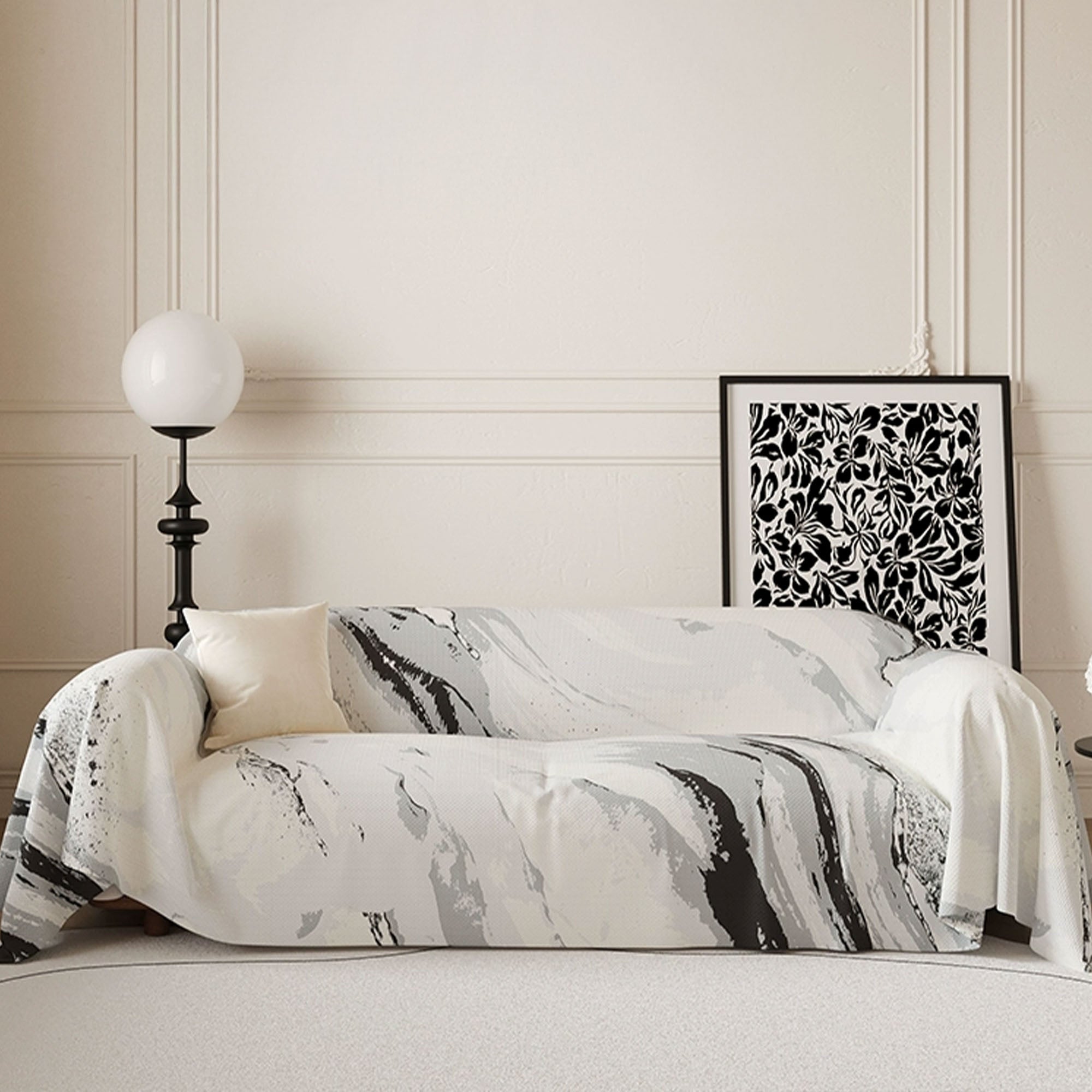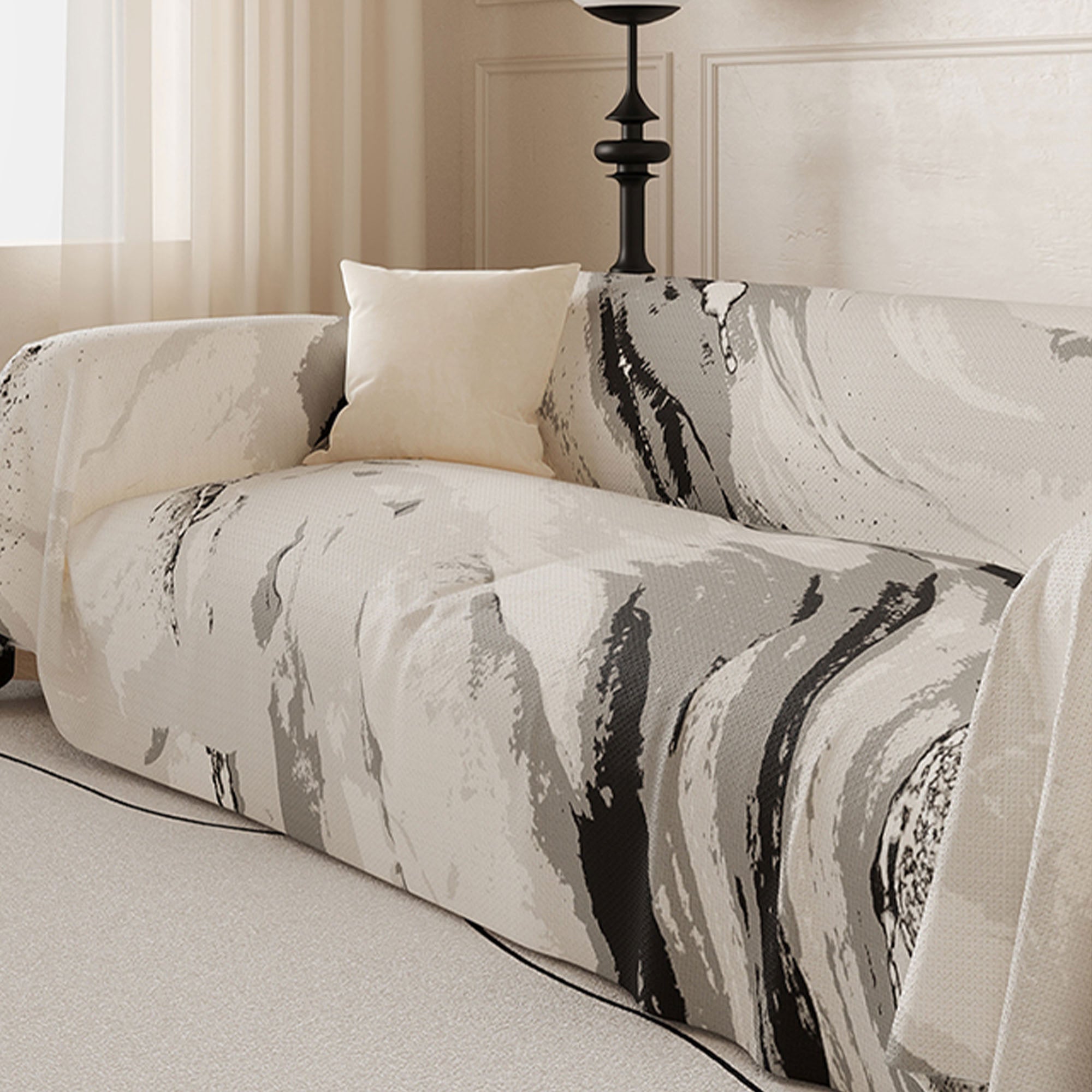 Løft rommet ditt med kunstnerisk ro. Marble Drift Linen sofatrekk har et feiende marmorinspirert mønster som flyter uanstrengt over møblene dine, og blander kunst med funksjonell design. Laget av pustende imitert lin, gir det en naturlig teksturert følelse samtidig som det beskytter sofaen din med moderne eleganse.