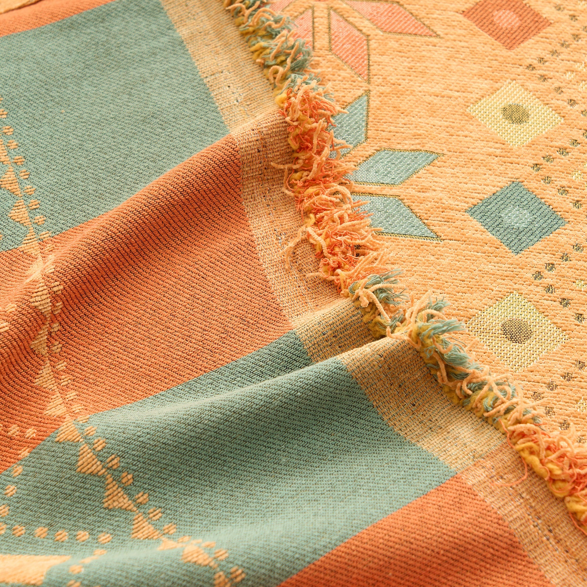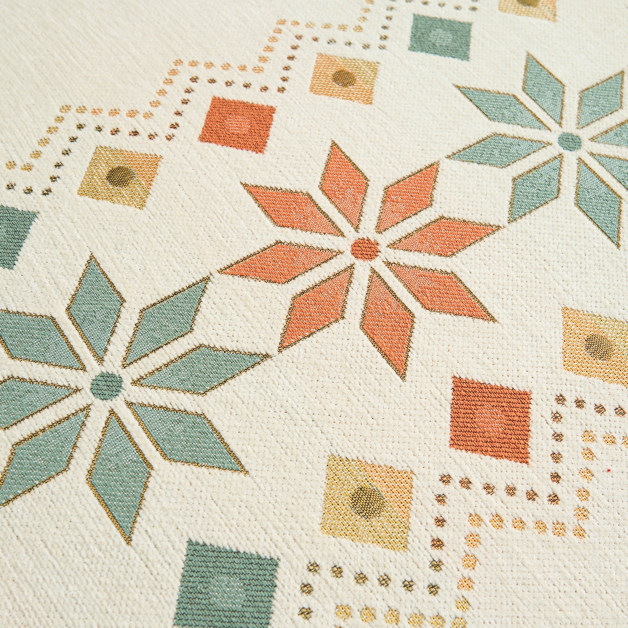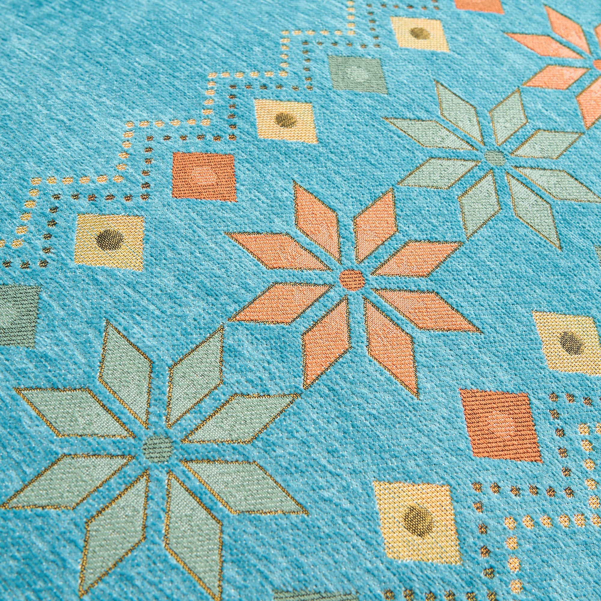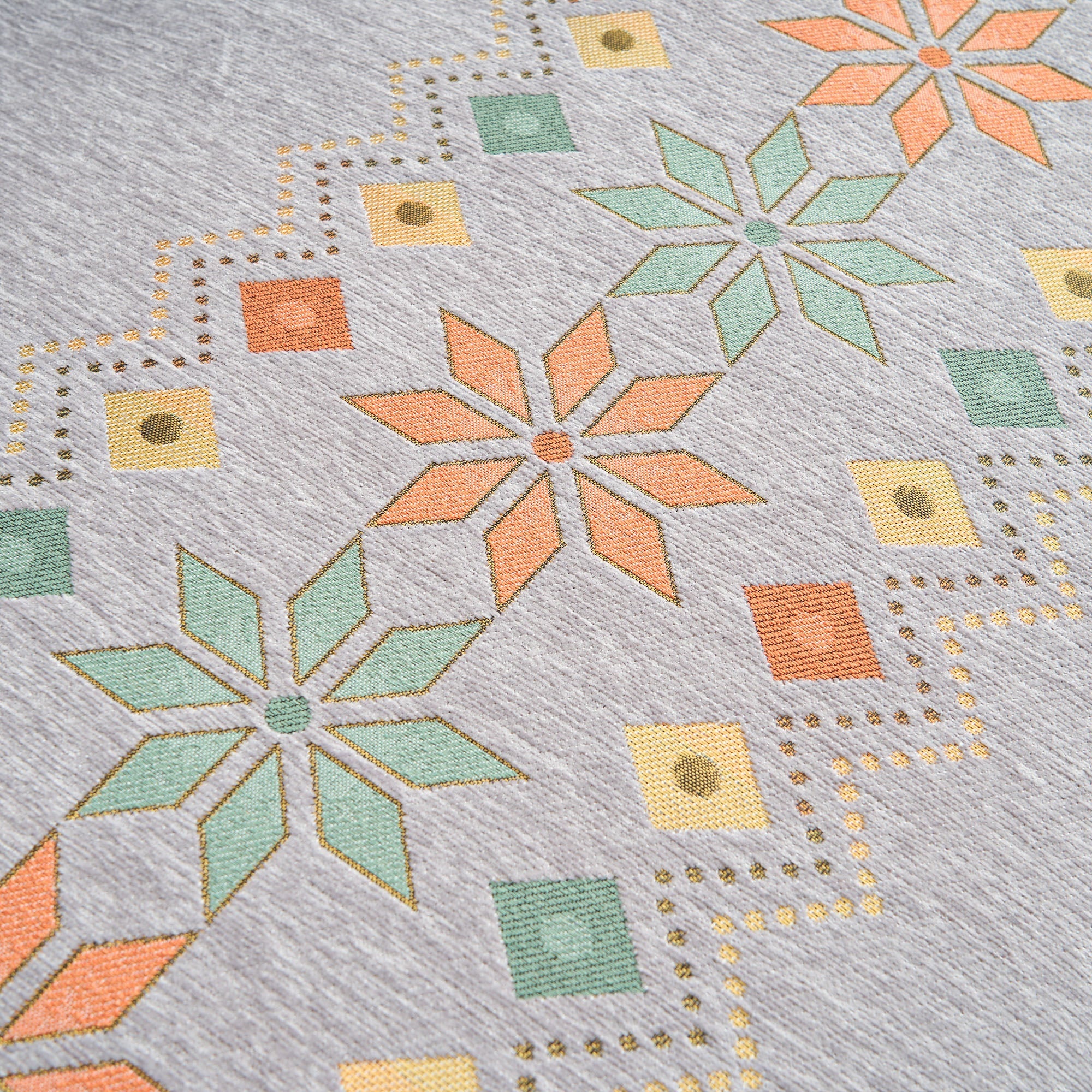 •Lys geometrisk design: Med et fargerikt nordisk-inspirert geometrisk mønster som løfter innredningen din med et trendy, kunstnerisk preg.