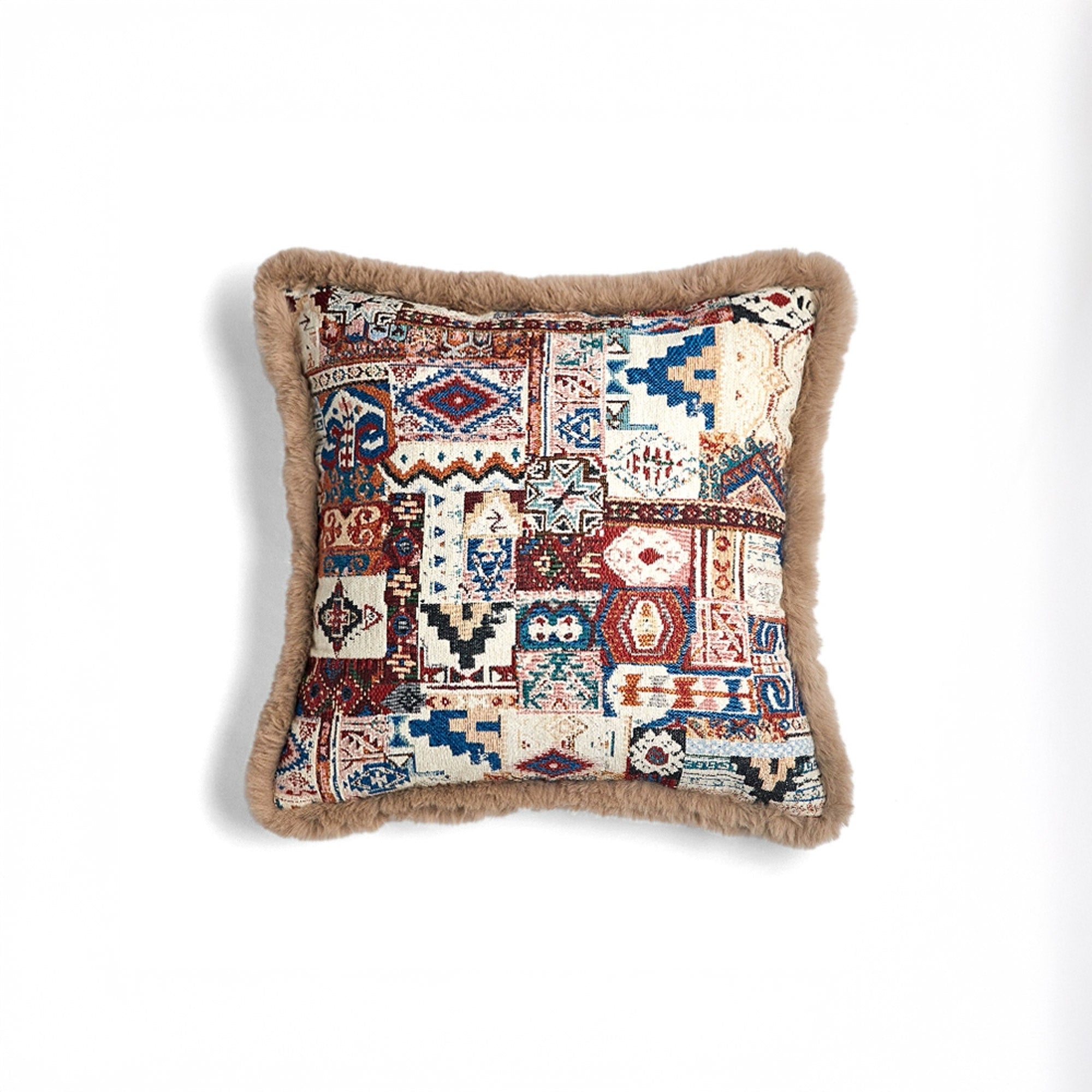 Introduser en koselig og eklektisk stemning i rommet ditt med denne bohemske lappeteppeputen! Med et levende utvalg av intrikate mønstre inspirert av tradisjonelle motiver, er denne puten et billedvev av farger og teksturer. De varme, jordnære tonene blander seg vakkert med innslag av blått og rødt, og skaper et fengslende visuelt midtpunkt.