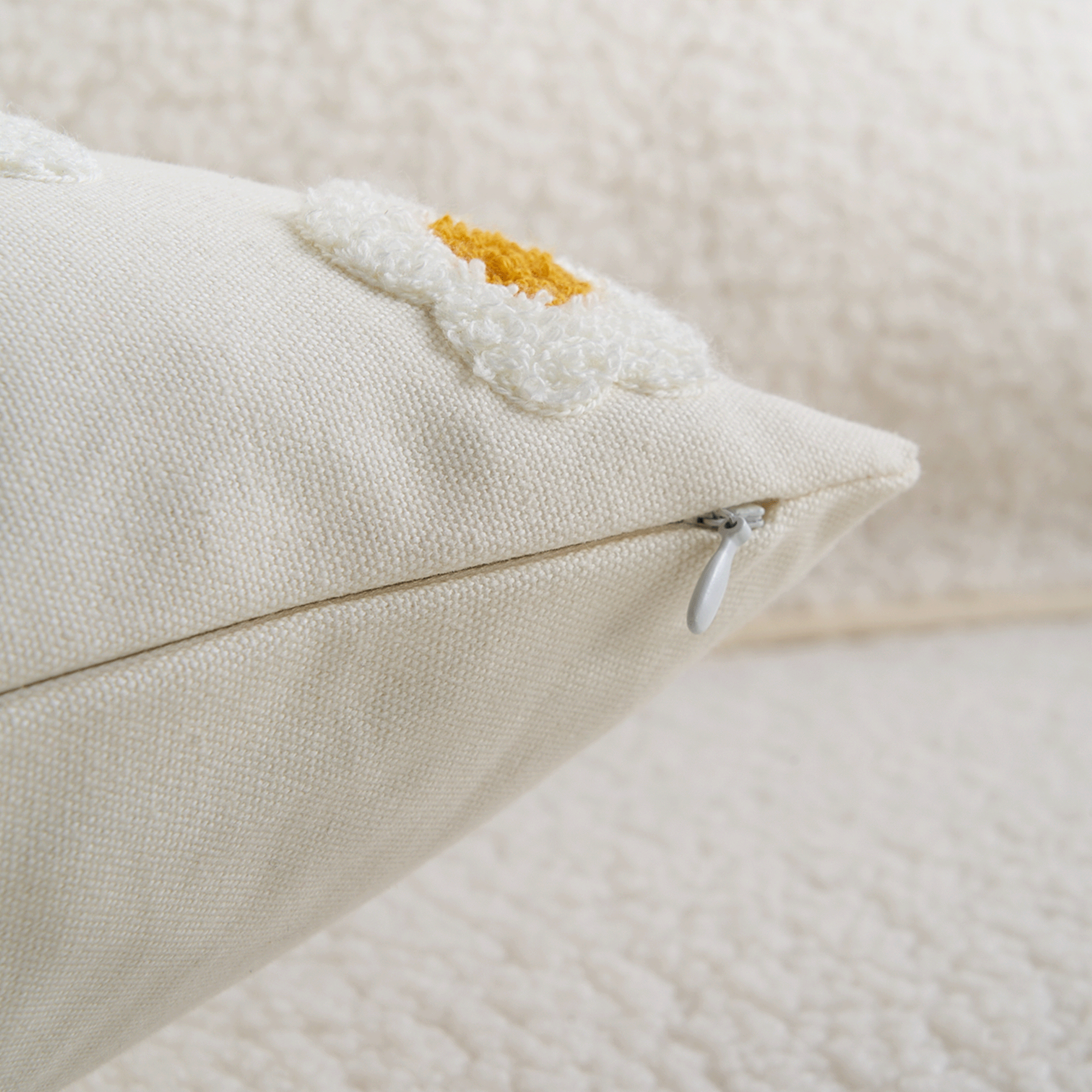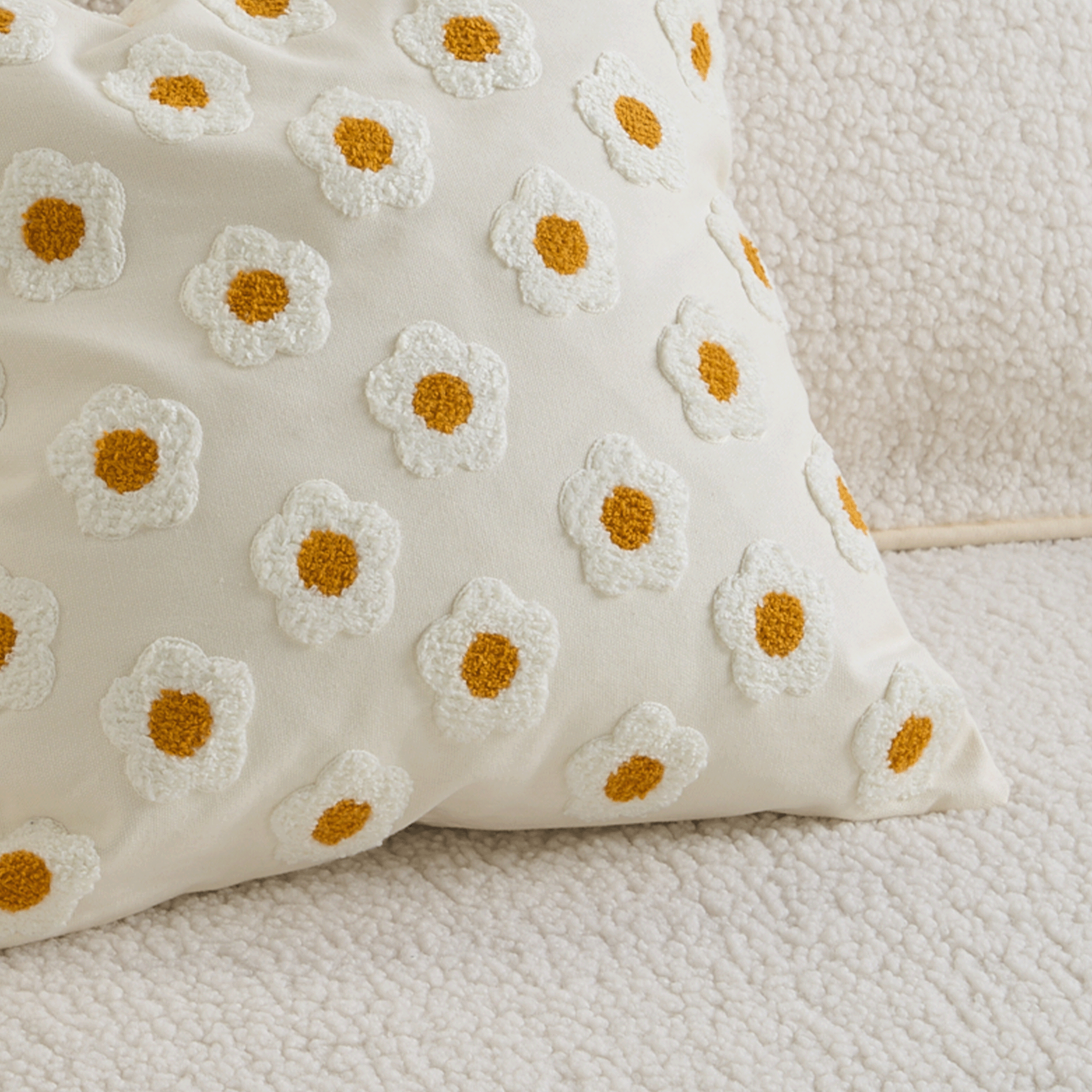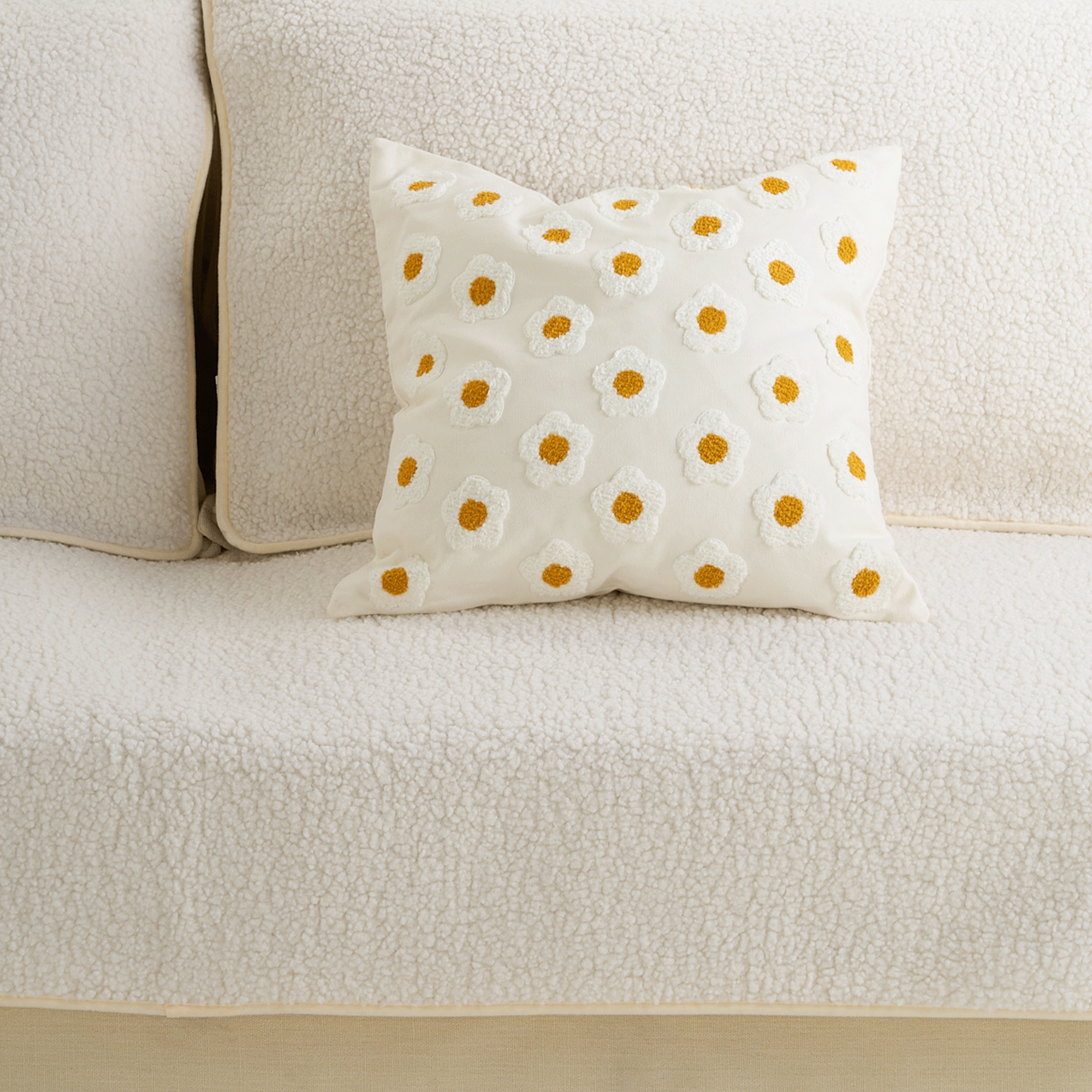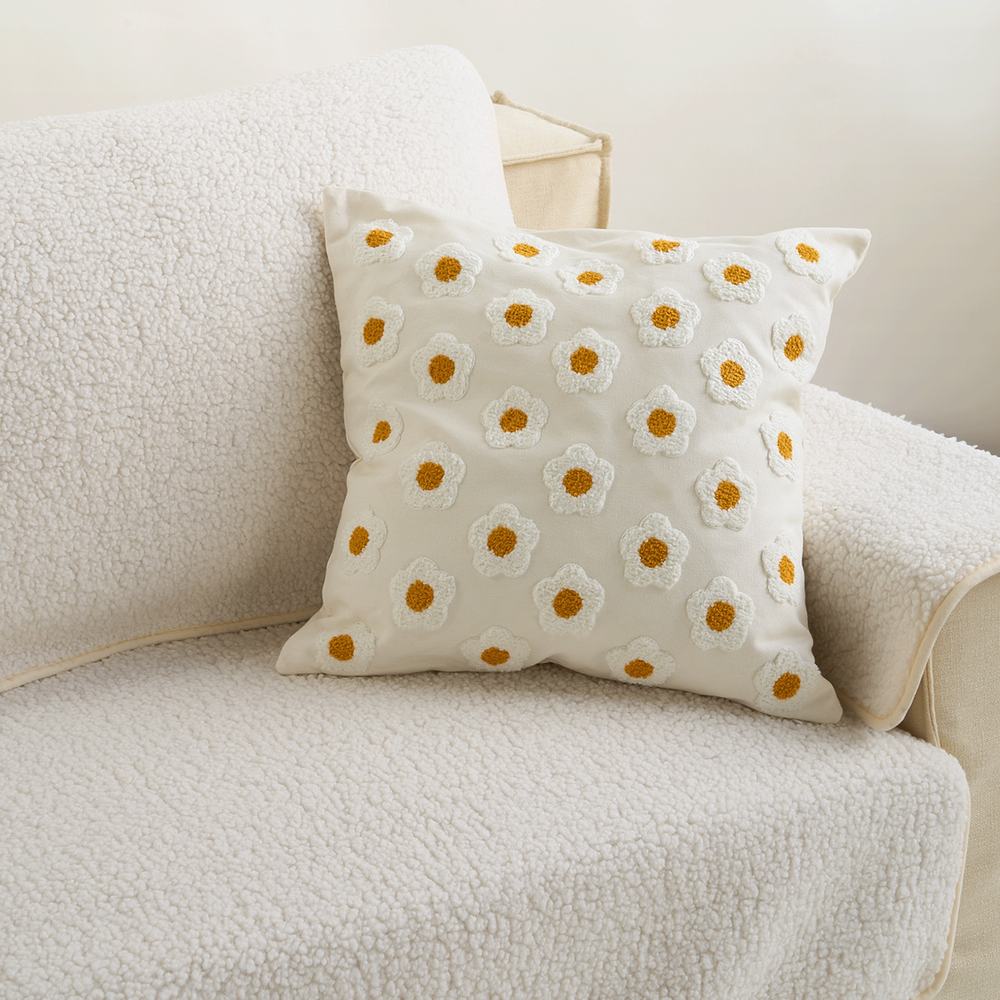 Tre inn i en fredfull eng med Daisy Dreams Sofa Pillow, hvor hver kos føles som å slappe av i et blomstereng. Denne kasteputen går utover bare dekorasjon; den er et taktilt eventyr, designet for å berolige med sin myke omfavnelse og teksturerte nytelse. Se for deg kronblader mot huden din, og tilbyr en unik sensorisk opplevelse som også fungerer som en sjarmerende stressavlaster. Pyntet med livlige, tredimensjonale broderte tusenfryd, fyller den ethvert rom med vårens friskhet. Den er som en bukett av komfort for sofaen din, og bringer et tusenfrydfylt eventyrland rett inn i hjemmet ditt.